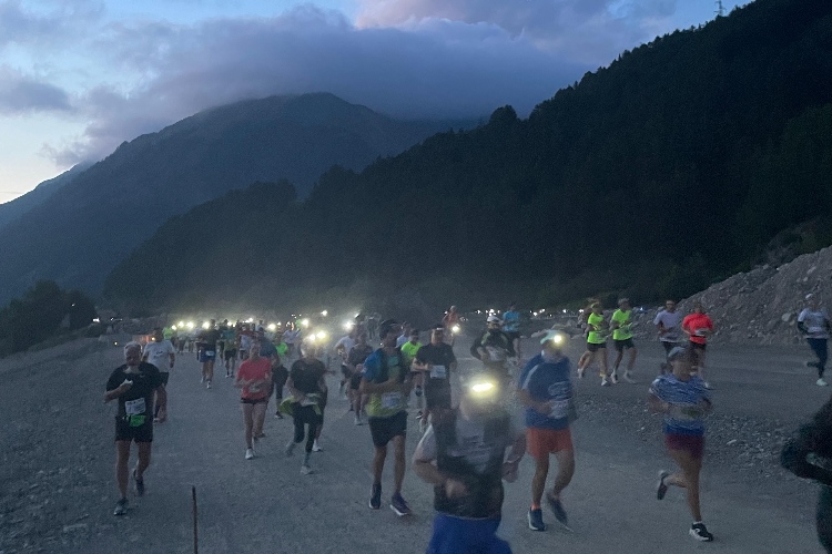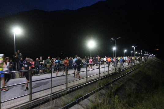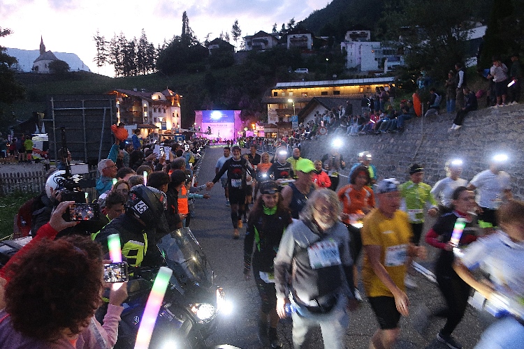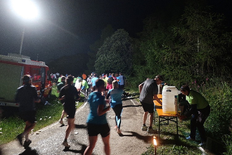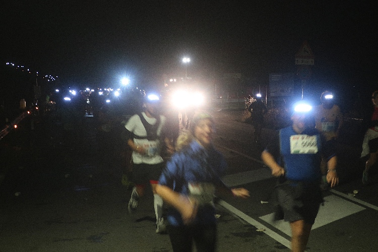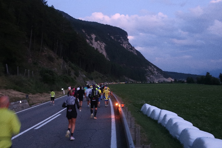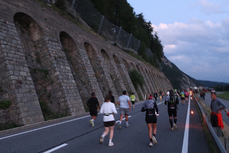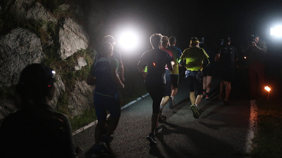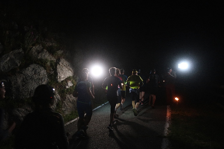 Vorbei an der hell erleuchteten kleinen Hotelzone Grauns tauchen wir schnell in die Dunkelheit ein. Auf den ersten beiden Kilometern bleibt uns die SS40 in voller Breite erhalten, was ein unbedrängtes Einlaufen ermöglicht. Etwa alle zehn Meter weist eine brennende Fackel den Weg – und das sich über die vollen 15 Kilometer bis ins Ziel nicht ändern. Einen beeindruckenden Anblick bietet der Lindwurm der laufenden „Glühwürmchen“, vor allem, wenn man einen Blick zurückwirft.