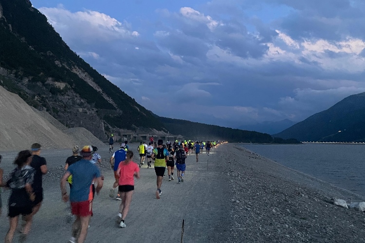 Nichtsdestotrotz ist die nächtliche Stimmung nicht minder beeindruckend. Hat man die erste der fünf Getränkestellen des Rundkurses zu Beginn der Staumauer hinter sich gelassen, läuft man entlang einer Allee leuchtender Lampen über den Damm. Mystisch türmen sich im Hintergrund die Umrisse der Berge. Fast komme ich mir vor wie auf der Rollbahn eines Flughafens beim nächtlichen Take Off, nur mit der Beschleunigung will es nicht so recht klappen.