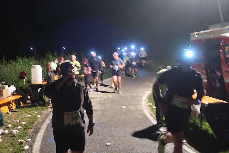 Fünf Kilometer sind am Ende der Dammkrone bewältigt. Auf den kommenden Kilometern schlängelt sich unser Weg in stetigem leichtem Auf und Ab als gut ausgebautes Asphaltband durch Wald und Wiesen, um diese Tageszeit lediglich changierend zwischen Dunkelschwarz und Hellschwarz. Doch auch hier weisen die Fackeln und Lichtpunkte der Stirnlampen den Weg durch die Finsternis. Kläglich sind allerdings meine Versuche, dies fotografisch einzufangen. So bleibt Euch nur, diese Stimmung in Eurer Fantasie nachzuvollziehen.