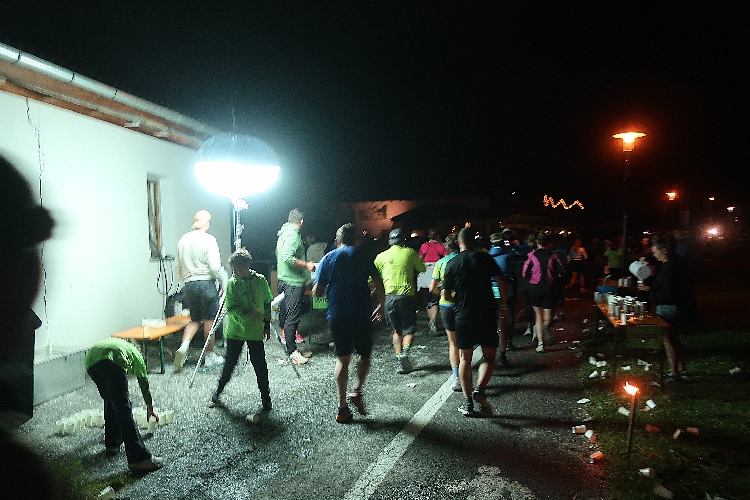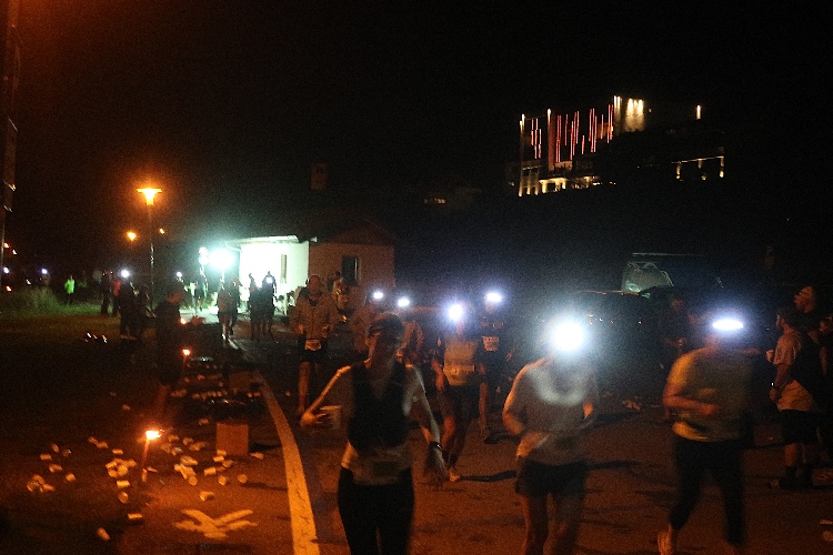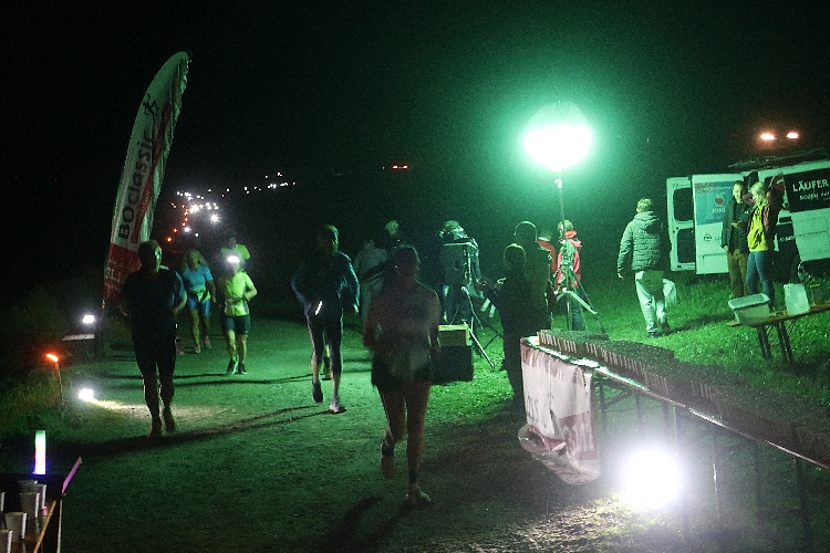 Eine Lichtoase in der Dunkelheit bei Kilometer 7,5 entpuppt sich als weitere, von Strahlern ausgeleuchtete Getränkestelle. Und weiter geht es durch die nächtliche Natur. Da, wo sich der Blick auf und über den See öffnet, kann man am gegenüberliegenden Ufer das hell erleuchtete Zielgelände erspähen. Vor allem auch hören. Die Musik und die Stimme des Zielmoderators dringen ungebremst bis zu uns hinüber.