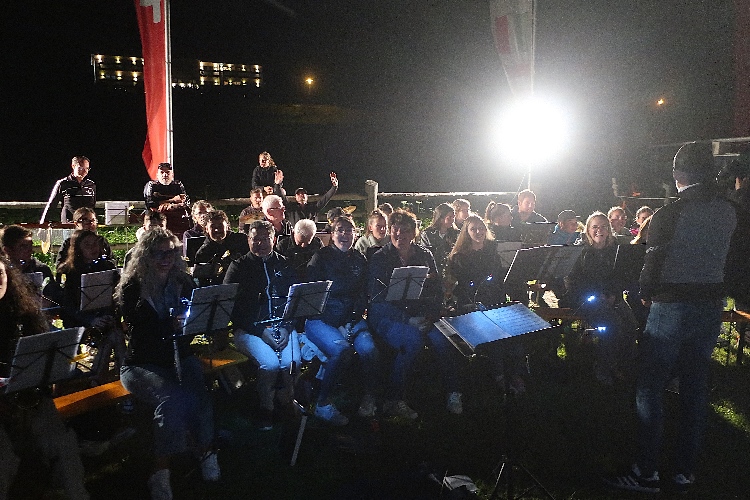 Die hell erleuchtete, fast schon kitschig rustikale Seeresidenz „Mein Dörfl“ nach 13 km markiert den nächsten optisch und auch akustisch herausstechenden Spot. Denn erwartet werden wir hier nicht nur von Zuschauern, sondern auch von einer Blaskapelle, die zu dieser späten Stunde noch für uns aufspielt.