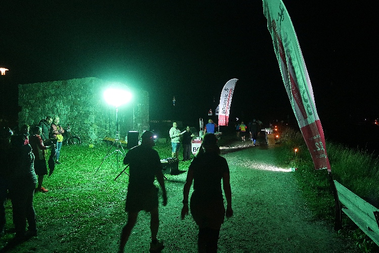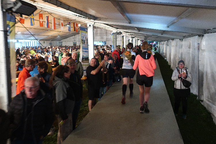 Wie ein weltentrückter Monolith ragt der ausgeleuchtete Alt-Grauner Turm aus dem Schwarz des Sees. Ein beeindruckendes Bild, das mich auf den letzten Metern begleitet. Am Veranstaltungsgelände angekommen, geht es sogleich hinein ins Festzelt und über den Laufsteg seitlich hindurch. Proppenvoll ist das Zelt und prächtig die Stimmung. Sekunden später bin ich schon wieder draußen und eile, so gut es eben noch geht, durch den Zielkanal dem Zielbogen entgegen.