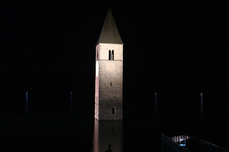 Mehr schlecht als recht mühe ich mich auf dem Uferweg dahin. In der Ferne sehe ich schon den angestrahlten Turm von Alt-Graun zunächst noch ganz klein als einsame Zielmarke aus dem nachtdunklen See ragen. Lichtblitze flackern über dem See, zunehmend begleitet von noch leisem Donnergrollen. Es beginnt zu regnen. Auch das noch … Ich versuche mein Tempo zu beschleunigen, um einer befürchteten größeren Dusche zu entgehen. Aber ich komme nicht mehr so recht in Schwung. Aber die Regenwolke zum Glück auch nicht.