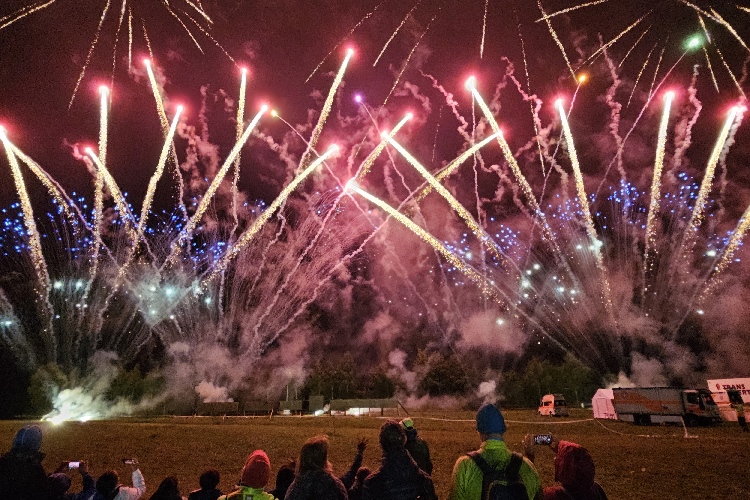 Von der Bühne ziehen die Menschentrauben mit Beendigung der Siegerehrung in Richtung Zielbereich. Gespannte Ruhe kehrt ein und dann ist es auf einmal soweit: Die finale Show beginnt.