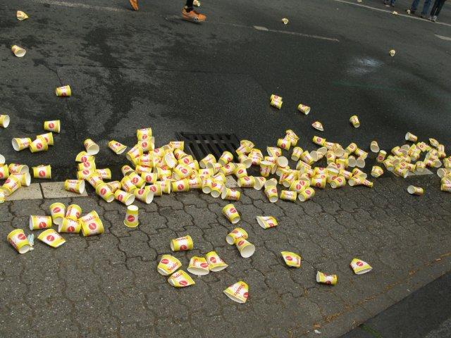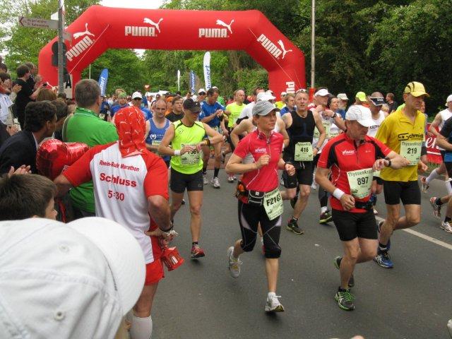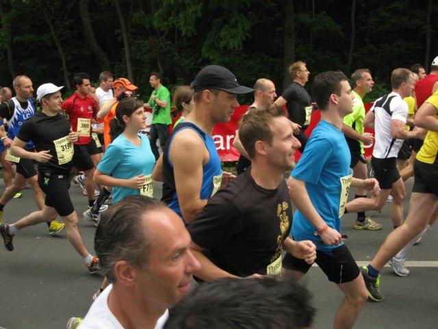 Inzwischen haben die Staffelläufer zu uns aufgeschlossen und kommen hier auch bald zu ihrem nächsten Wechselpunkt. Sie müssen unterschiedliche Streckenlängen zwischen 7 und 14 Kilometer zurücklegen. Das ist ja nicht schlecht, da man so auch schwächere Läufer einbinden kann. Die Zahl der Staffeln ist auf 250 begrenzt, eine Grenze, welche aber nicht ausgeschöpft wird. Merkwürdig, in Düsseldorf kennt man ganz andere Staffelzahlen.