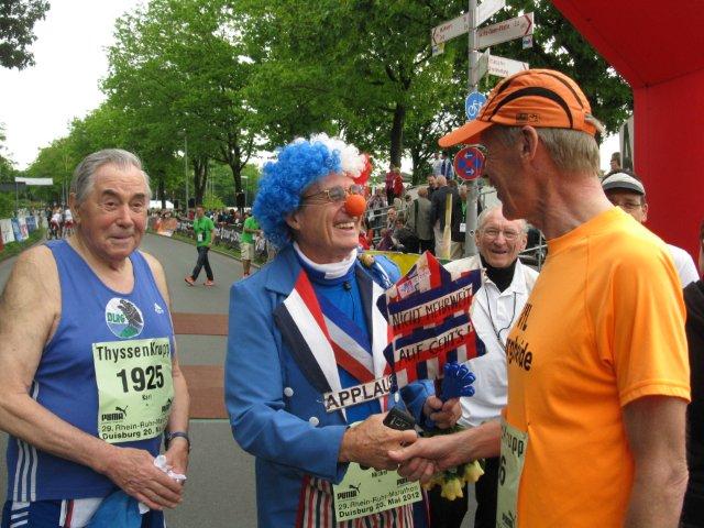 Ich treffe bald Roland und wir setzten uns noch auf den Rasen um die schöne Atmosphäre zu genießen und uns in Ruhe zu erfrischen. Um mich herum sehe ich nur zufriedene und glückliche Gesichter. Ich entdecke Inge und Christiane auf der Tribüne, welche meinen Zieleinlauf wieder fotografisch festgehalten haben. Bald kommen auch Bernd, Reinhard und Lara. Bernd hat beim Halbmarathon den ersten Platz in seiner Alterklasse M75 geschafft, und Reinhard Platz 2 in der M65. Beide erhalten einen schönen großen Pokal und noch einen Sachpreis. Lara hat mit 3:58:18 eine neue persönliche Bestzeit geschafft und die magische 4 Stundengrenze unterschritten.