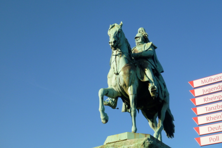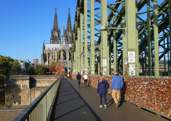 Nach dem Frühstück will ich als erstes auf die Messe und mir die Startunterlagen abholen. Ich wähle nicht den schnellsten Weg per U-Bahn und Straßenbahn, sondern gehe zu Fuß. Die Hohenzollernbrücke ist meine erste Station. Zwischen 1907 und 1911 wurde die Brücke für die Eisenbahn und den Automobilverkehr errichtet. Zum Ende des Zweiten Weltkrieges wurde sie von den Deutschen zerstört und in den Nachkriegsjahren wieder aufgebaut. Eine wesentliche Verbesserung erbrachte dann der Bau einer zusätzlichen Brücke. So fahren heute über 1200 Züge über das Bauwerk mit dem meisten Eisenbahnverkehr in Deutschland. Vier Reiterstandbilder (König Friedrich Wilhelm IV und die Kaiser Wilhelm I, Friedrich III und Wilhelm II) zieren die Brückenrampen. Auf beiden Seiten können Fußgänger und Radfahrer den Rhein überqueren. Auf dem Fußweg marschiere ich direkt auf den Kölner Dom zu.