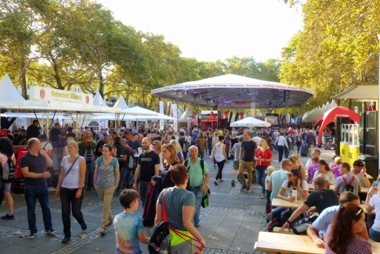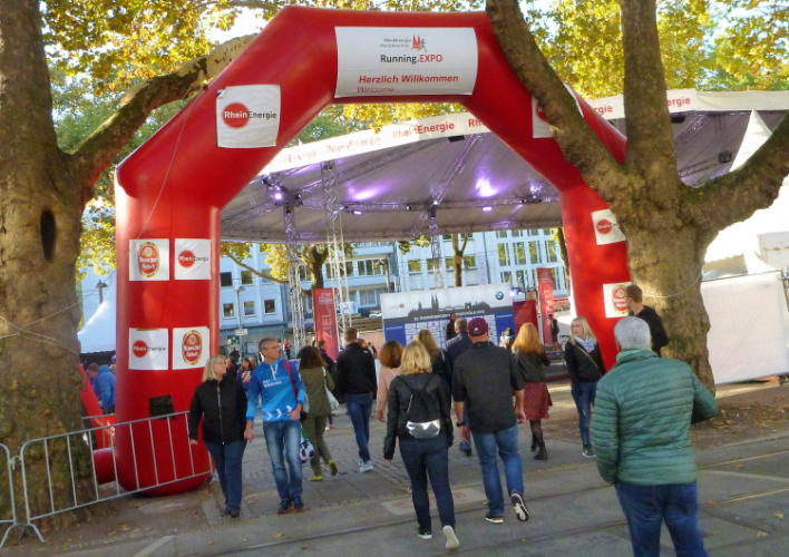 Mein Weg führt mich weiter durch den verkehrsberuhigten Bereich der Hohen Straße, eine fast 700 Meter lange Fußgängerzone, wo sich ein Geschäft neben dem anderen findet. Und es wird auch richtig viel Geld umgesetzt: Man findet sich hier auf Platz 8 der meistfrequentierten Einkaufsstraßen in Deutschland. Noch mehr Umsatz wird in der Schildergasse (Rang 4) erzielt, die hinter der Zeil (Frankfurt) und der Kaufinger und Neuhauser Straße (jeweils München) liegt. Am Ende der Schildergasse sehe ich dann den Neumarkt (Straßenbahn- und U-Bahn-Station). Der „Nümaat“, so der Kölner zum größten Platz in der Altstadt, hat 8600 Quadratmeter Nutzfläche. Weihnachtsmarkt, Zirkusvorführungen und dergleichen finden hier statt. Und erst seit kurzer Zeit werden hier die Startnummern ausgegeben und es gibt sogar eine Laufmesse. Im Vergleich zur Anzahl der Sportler, die morgen am Laufevent mitmachen, ist die Messe eher klein gehalten. Aber verhungern und verdursten braucht deshalb keiner, denn es stehen einige Foodtrucks bereit.