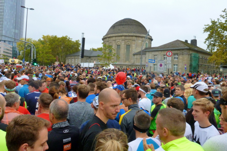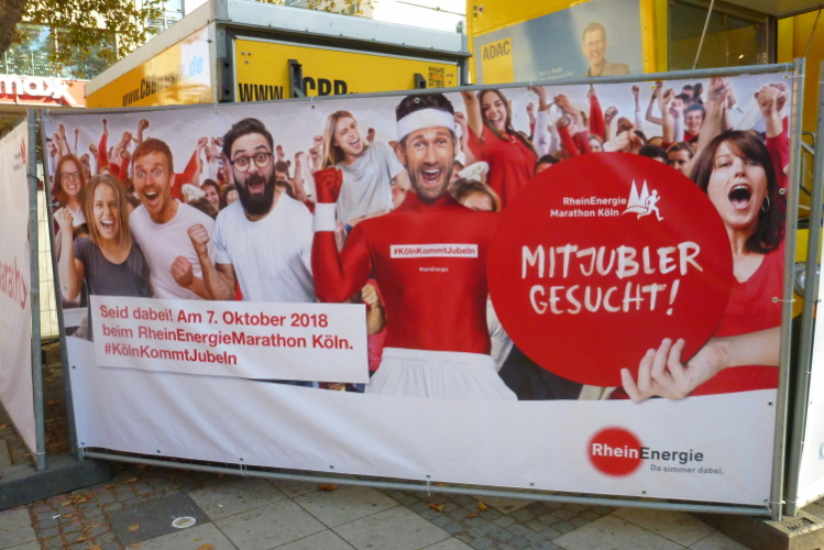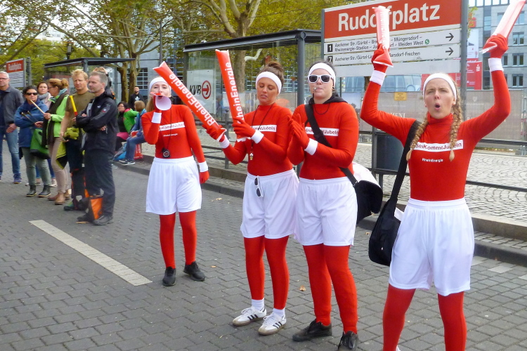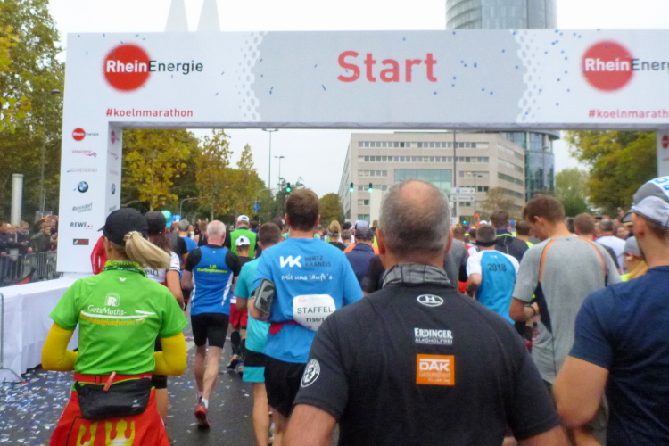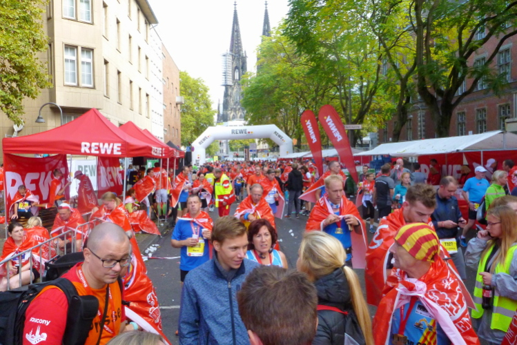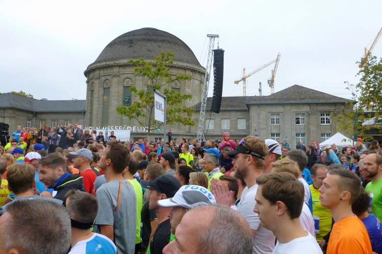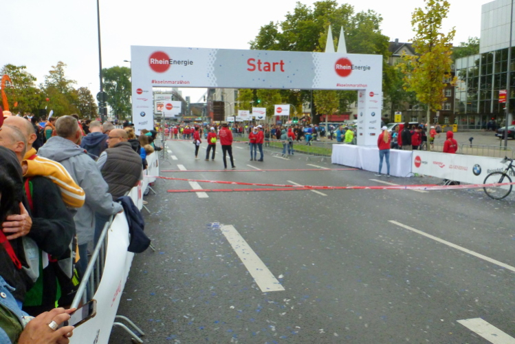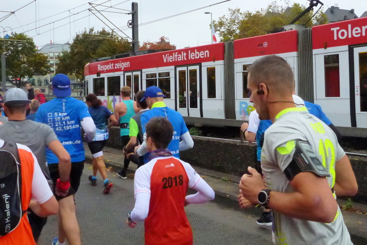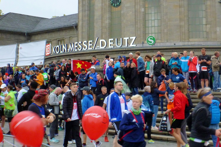 Gegen 08.15 Uhr verlasse ich die Jugendherberge durch den Hintereingang und stehe nach einer Minute vor dem Bahnhof Deutz, wo die meisten Teilnehmer aus den Öffentlichen aussteigen. Die Startnummer berechtigt zur kostenlosen Nutzung des ÖPNV. Fast im Minutentakt kommen die Bahnen an und haben die gut 6000 Marathonis und 12000 Halbmarathonis hertransportiert.