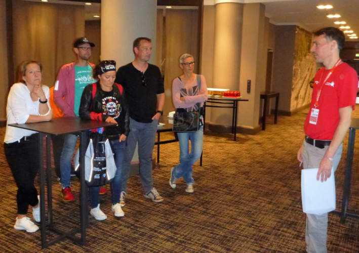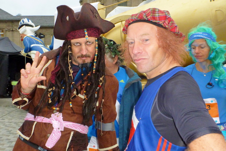 Ich bin erst auf halben Weg beim Erkunden der Läufermesse, da klopft mir einer von hinten auf die Schulter: Dirk Pretorius, der bei der Nummernausgabe hilft und mich gleich zu einem Vormittagsgetränk („wir trinken jetzt ein Kölsch, das kennste noch nicht“) überreden will. Doch vorher werden die essentiellen Dinge erledigt. Startnummer, Kleidersack (in Rucksackqualität) und dann wird noch das eigens georderte Shirt von mir in Empfang genommen. Die Anrainer sind froh über die Aktivitäten am Neumarkt, so werden doch die „Nümaatsbroder“ abgehalten, sich hier aufzuhalten. Das sind Müßiggänger, die hier herumlungern, trinken und mit Drogen dealen.