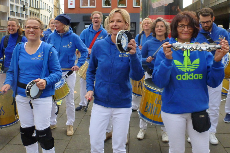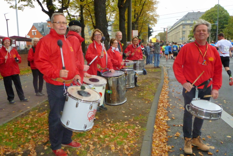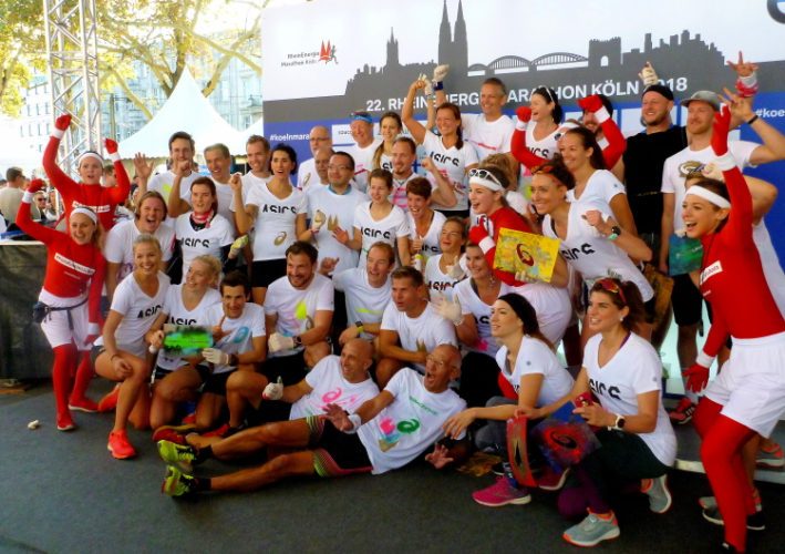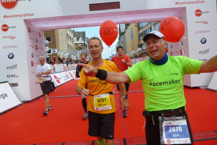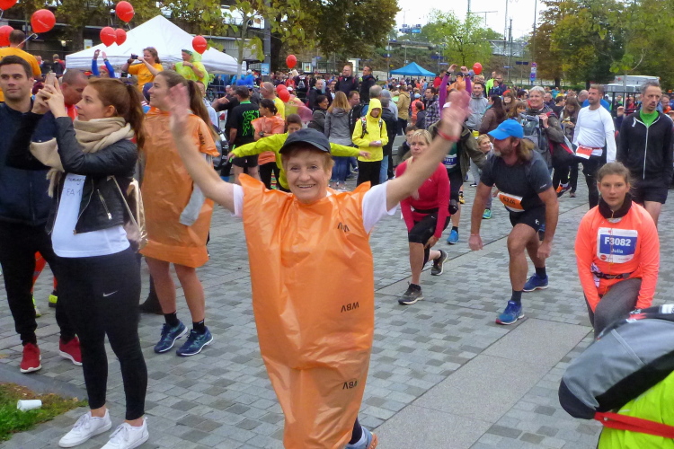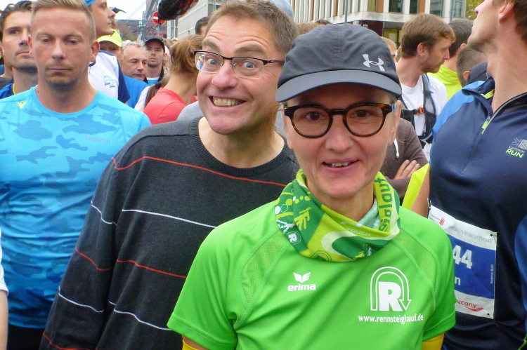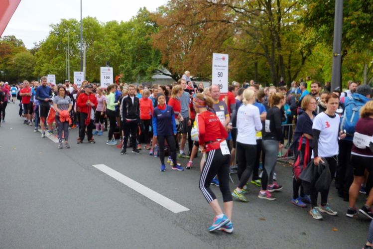 Ich begebe mich zum Ottoplatz, wo sich die Zeitläufer für die letzte Absprache treffen. Für einige Bilder reicht meine Zeit. Krista vom Pacerteam hat einen Handbesen dabei, mit dem sie die Letzten ins Ziel kehren will. Schaun mer mal. Die Stimmung aus lauter Mitklatschmusik und letzten Infos brodelt über. Man glaubt fast im Bierkönig auf Mallorca zu sein, oder auf einer Prunksitzung im Karneval. „Sha-La-La-La-La-La aus der Stadt mit K(a)“ wird gesungen, die Leute schunkeln. Letzte Sekunden, dann geht der erste Block unter Strom mit Hells Bells von AC/DC auf die Strecke. Wir folgen in einigen Minuten Abstand um 10.03 Uhr. Ich überquere die Zeitmatte, die Uhr läuft.