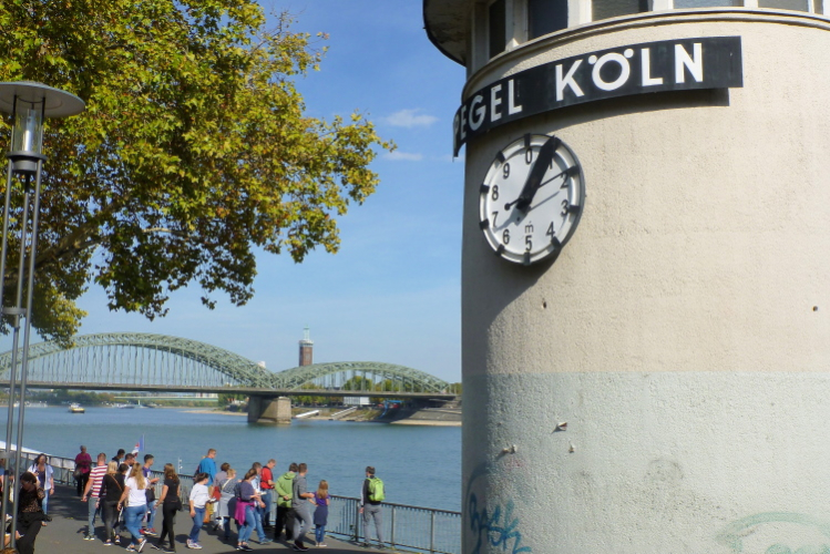 Wir verlassen den Ottoplatz mit dem Bahnhof Köln Messe/Deutz auf der Mindener Straße. Zur Kölner Messe und zur Lanxess arena ist es nur ein Katzensprung. Die Einteilung in mehrere Blöcke ist angebracht, denn würde man alle auf einen Sitz loslassen, ginge es ohne Ellenbogenchecks nicht ab. Noch vor dem ersten Kilometer laufe ich auf die Deutzer Brücke. An der Stelle errichteten bereits die Römer um 310 herum eine Holzbrücke, die auf steinernen Pfosten ruhte. Die heutige Brücke wurde endausgebaut im Jahr 1976/1980, da kam ein zweiter Übergang in Spannbetonweise hinzu. Die Aussicht auf Rhein, den Dom und die Kirche Groß St. Martin ist ähnlich spektakulär, wie der in Frankfurt von der Alten Brücke auf die Skyline.