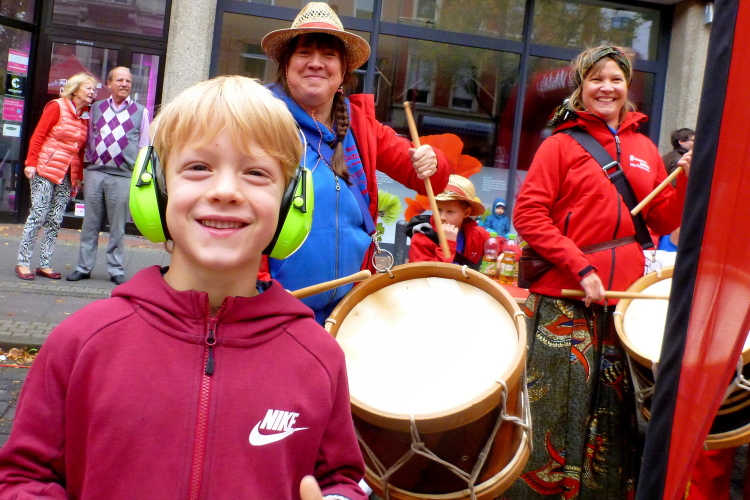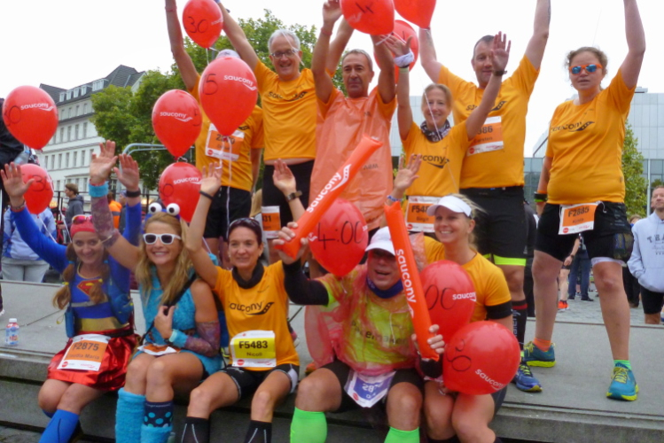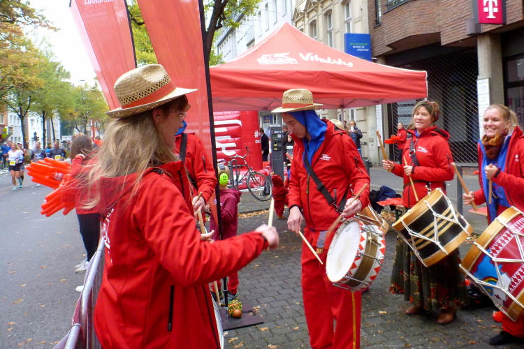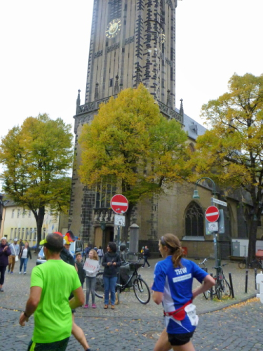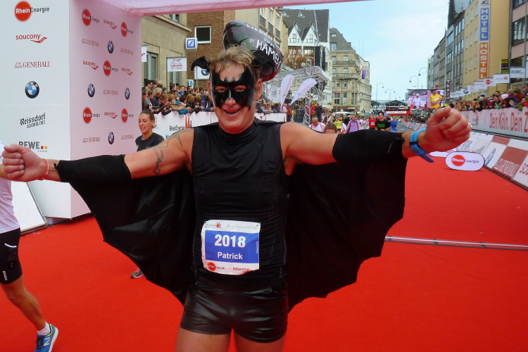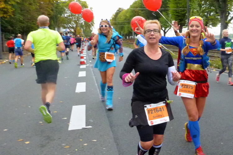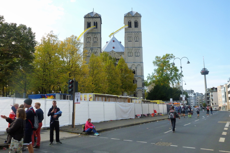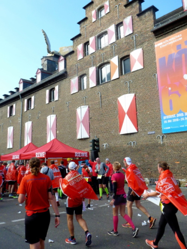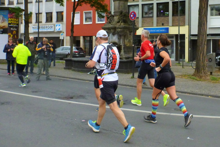 Ein paar Schritte entfernt sehe ich auf der linken Seite die katholische Pfarrkirche St. Severin, eine von zwölf romanischen Basiliken in Köln. Die Urkirche wurde bereits im 4. Jahrhundert errichtet und erst später erweitert. Kilometer 14, der Kurs läuft nun auf den Neumarkt zu, dort, wo am Vortag die Stadtnummern ausgegeben wurden. Über die Hahnenstraße erreichen wir dann den Rudolfplatz, einer der Hotspots für unheimlich viele Zuschauer. Zum Glück kommen wir hier noch drei Mal vorbei. Dann laufe ich ein Christopher (Cologne Crew) im Kostüm des Leibhaftigen auf. Einen Zuschauer höre ich noch zu einem Kind sagen: „Da ist der Beelzebub“.
