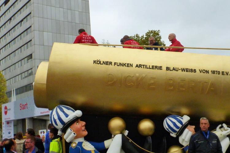 Große Wegweiser erleichtern uns die Orientierung. So werden wir für die Abgabe der Klamotten zum Radweg, der zur Hohenzollernbrücke führt, geschickt. Dort warten Lkw des Logistikers UPS. Ich gebe meinen Rucksack ab. Die Klamotten werden in Richtung Ziel gefahren, wo wir sie wieder in Empfang nehmen können. Dazwischen liegen dann 42,195 Kilometer, die sehr flach durch die Stadt führen. Maximal 14 Höhenmeter weist der Kurs auf. Ein schnelles Pflaster!