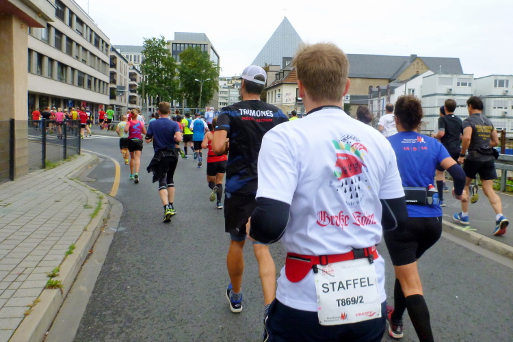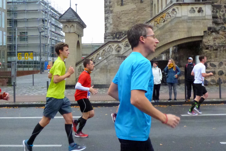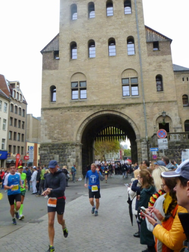 Severinstorburg, Kilometer 12. Wir haben wieder die mittelalterliche Stadtmauer erreicht. Die ist zwar nicht überall zu erkennen, doch einige Tore, Türme und dergleichen sind noch vorhanden. Die Anlage wurde im 13. Jahrhundert errichtet und hatte die Aufgabe, die Straße nach Bonn zu sichern. Außerdem wurden damals an dem Tor Adlige empfangen. Auf uns wartet das moderne Tor einer Versicherung, die die Veranstaltung als Sponsor begleitet. Die Staffeln wechseln hier zum ersten Mal. Clever gemacht, denn der Wechsel der Teams wird auf der Seite durchgeführt, wir werden nicht behindert.