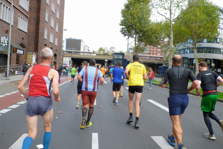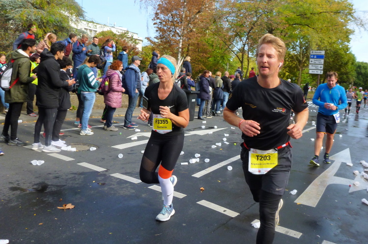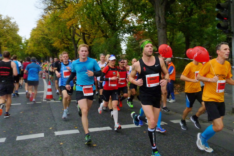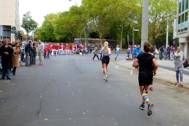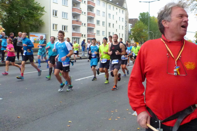 Oberländer Ufer, Gegenverkehrsbereich. Ne, keine Autos kommen uns entgegen, sondern auf der anderen Seite der Straße die Spitze des Frauenfeldes. Sabrina Mockenhaupt, zierlich wie sie ist, versteckt sich in einem Männertrupp von fünf bis sechs Läufern. Später höre ich, dass sie in einer Staffel gelaufen ist. Kurz danach kommen uns die 3-Stunden-Pacer mit mindestens 20, 30 Athleten in einem Affenzahn entgegen.