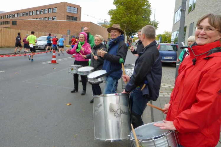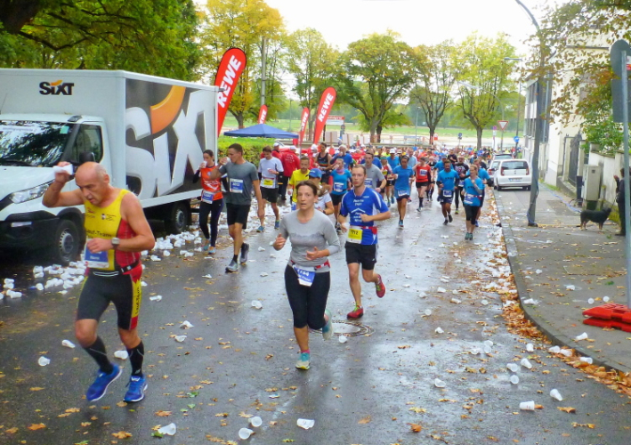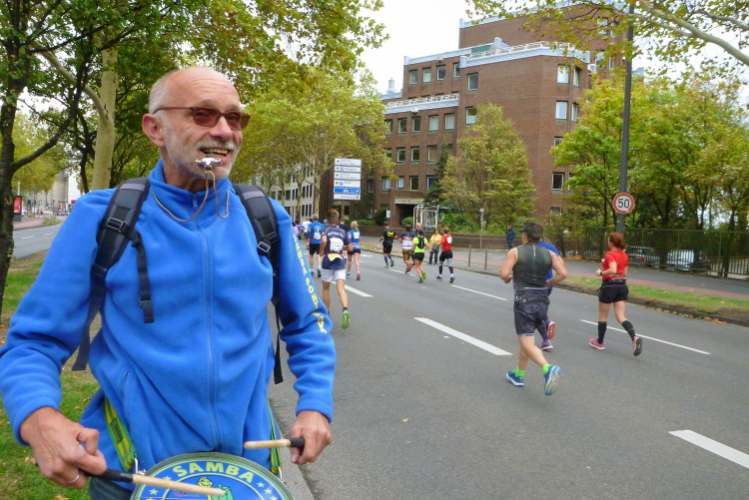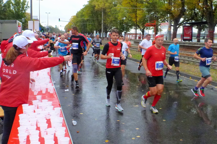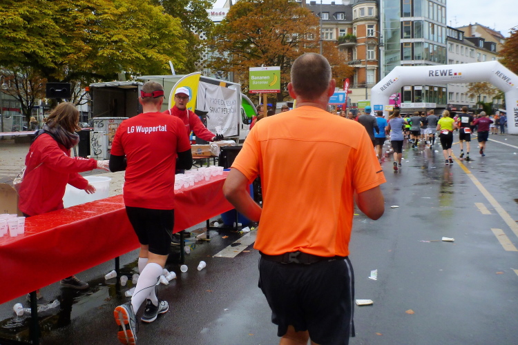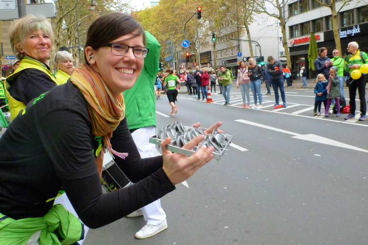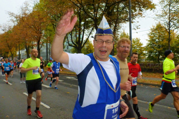 Überhaupt, es gibt hier viel zu sehen. Gleich auch den ersten Jeck, laufenderweise mit Narrenhut: Arno vom Verein Funken Feinripp, das letztere hat er aber nicht am Leib. Ich werde den Arno noch öfter sehen. Den vierten Kilometer haben wir bei der Südbrücke abgehakt. Gleich danach folgt die erste Trinkstelle, wo es Wasser gibt. Später wird noch Iso, Cola, Bananen und vereinzelt auch Gel gereicht. Viel trinken brauche ich jetzt noch nicht, denn die 25 Grad vom Vortag haben sich durch den nächtlichen Regen verflüchtigt. Die eingelagerte Kaltfront drückt jetzt das Thermometer auf 12, 13 Grad. Für uns perfekt, bei den Zuschauern sehe ich schon vereinzelt Mützen und Handschuhe.