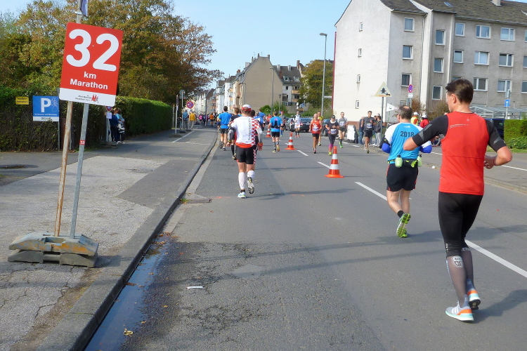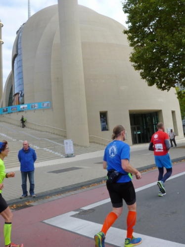 Kilometer 27, Innere Kanalstraße, wir laufen an der DITIB-Zentralmoschee vorbei, die erst vor wenigen Tagen in Anwesenheit des türkischen Staatspräsidenten eingeweiht wurde. Hier stehen kaum Zuschauer. Weiter. Wir unterqueren die Eisenbahnlinie nach Aachen und erreichen den Hansaring, der uns zum Ebertplatz bringt. Da wechseln die Staffeln zum letzten Mal. Die Wolkendecke bekommt Löcher und nach weiteren Minuten reißt es auf. In der Sonne wird es angenehm warm.