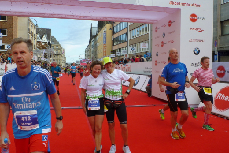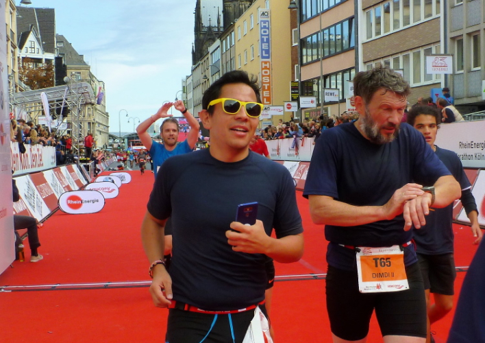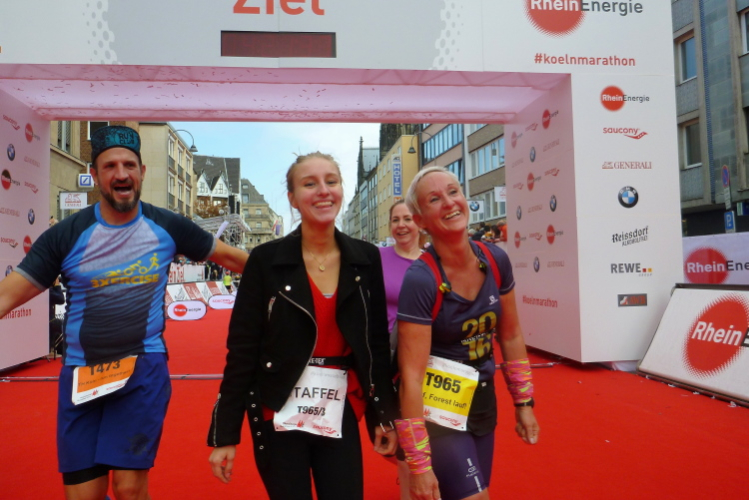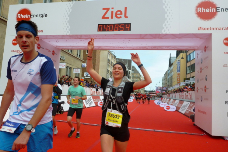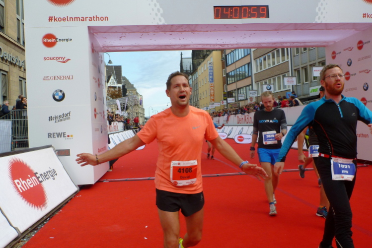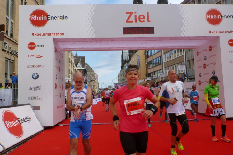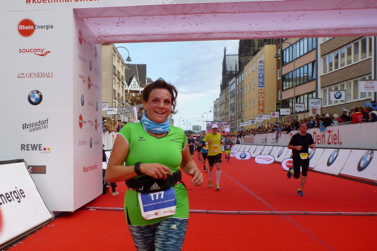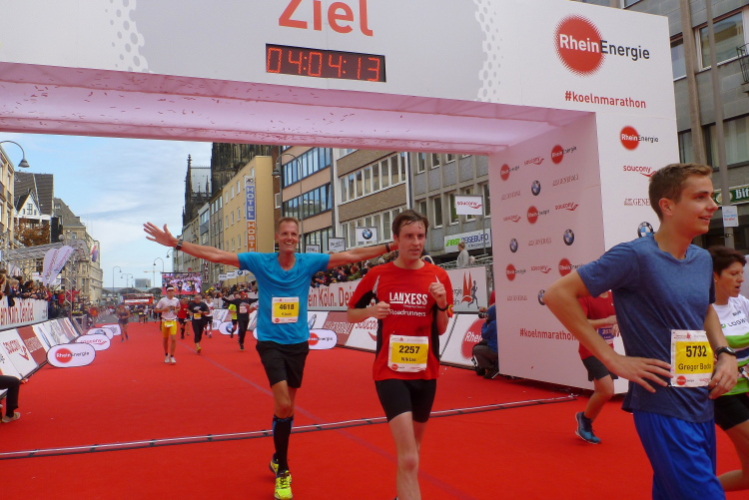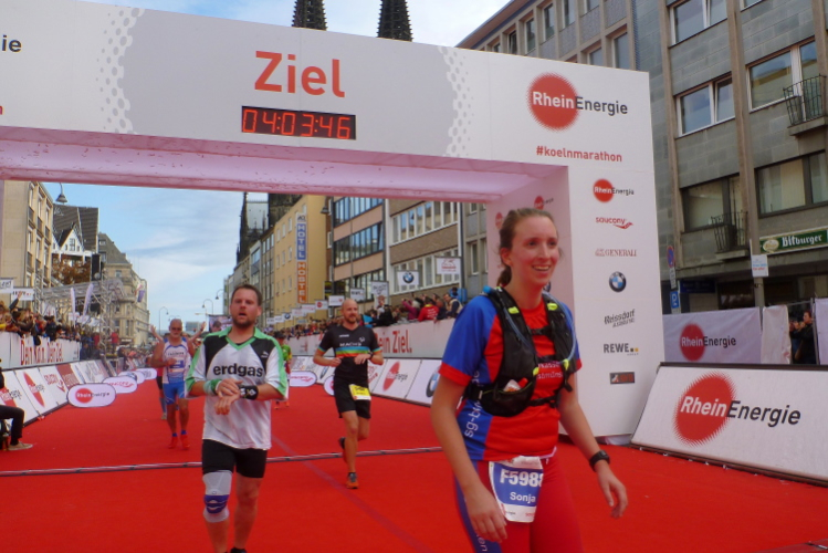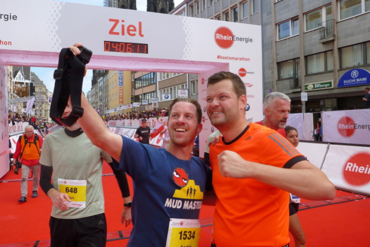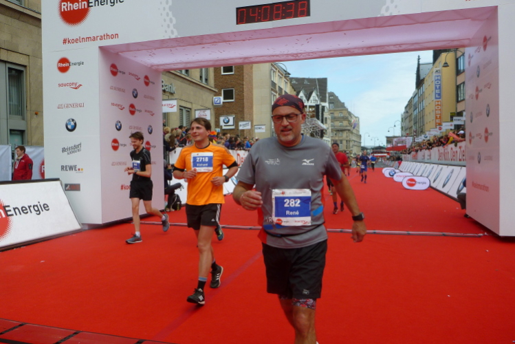 Kilometer 41, wir sind noch auf der Cäcilienstraße und biegen dann in die Hohe Straße ein, die uns weiter Richtung Dom bringt. Und dann ist es soweit: Ich sehe beide Turmspitzen nur kurz, dann geht es auf den Kardinal-Höffner-Platz und ich sehe den Dom in seiner ganzen Pracht. Der Dom ist das Ziel, habe ich mehrmals auf Plakaten gelesen. Und nun ist so weit. Noch mal Gänsehaut, nicht nur bei mir. Ich ziehe weiter mein Tempo an, biege dann links in die Komödienstraße ein, wo ich ein Gardemädchen für ein Selfie heranhole. Auf dem Zielbogen steht eine 3.58 Stunden brutto. Das geht locker sub vier aus. Nur eine Minute später renne ich ins Ziel. Geschafft. Ich ziehe meine Kamera heraus und gehe nach ein paar Schnauferern meiner Arbeit nach.