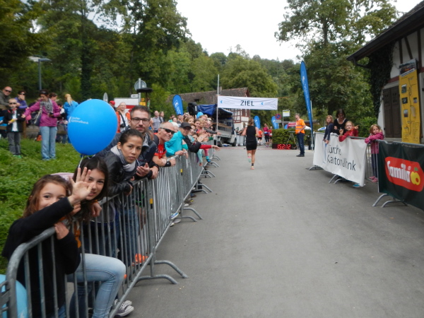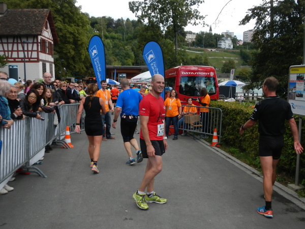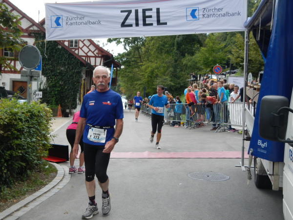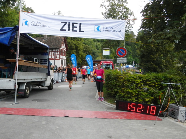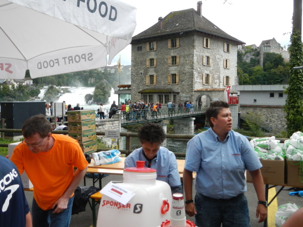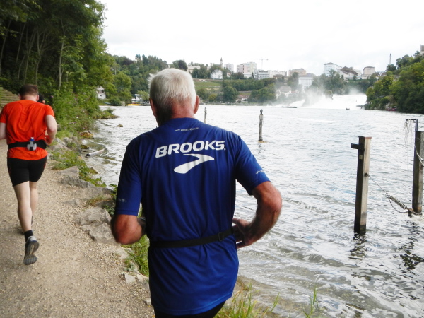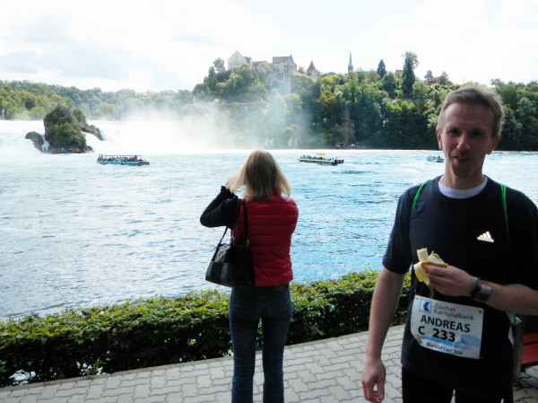 Leider ist um diese Uhrzeit der Sonnenstand so, dass der Rheinfall in einem diffusen Licht erscheint. Ich gehe aber davon aus, dass nur die Wenigsten ihren Blick wirklich auf diese Naturschönheit gerichtet haben. Ich glaube, das Zielbanner und die Zeitmessmatte haben jetzt einen höheren Stellenwert. Ich muss gestehen, ich blicke nur zum tosenden Wasser, um zu sehen, ob ich werbetaugliche Bilder schießen kann und schiebe noch ein Brikett nach. Ich freue mich, dass ich mich nach diesen 20,2km noch so gut fühle, unterwegs genug Sauerstoff in den Körper bekam und noch Reserve habe.
