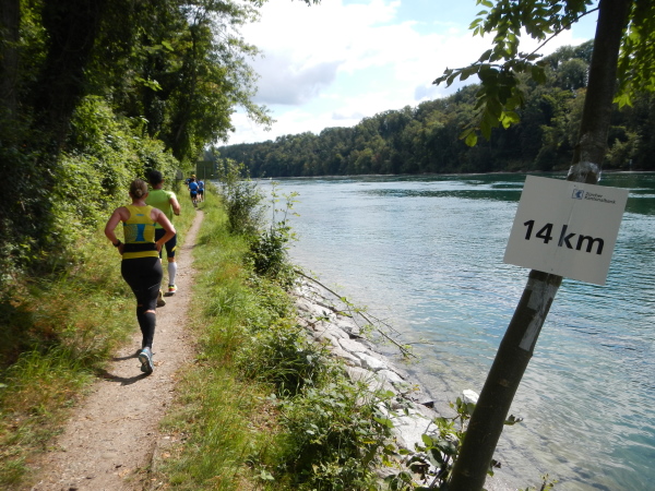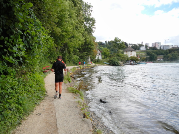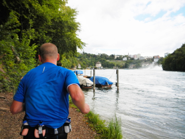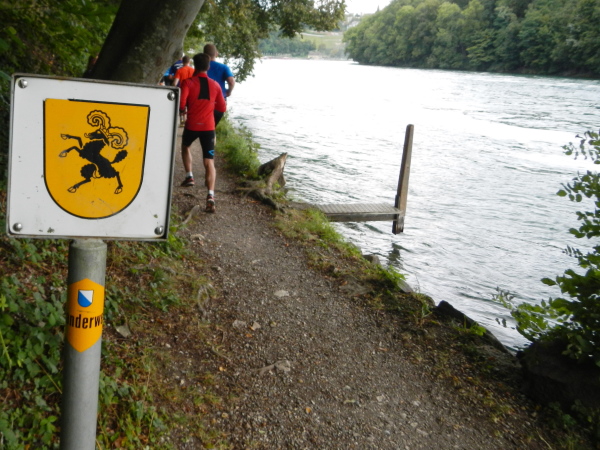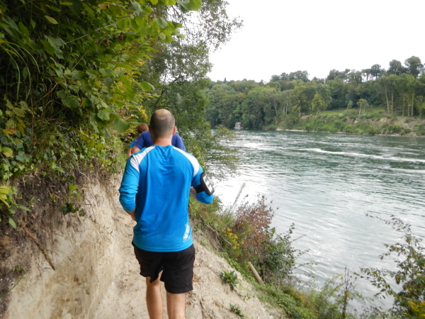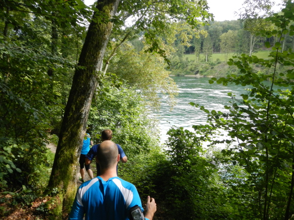 Mit dem Überqueren des Wehrs beim Kraftwerk wird auch die Grenze nach Deutschland überschritten. Das rechte Rheinufer ist der östlichste Teil des Jestetter Zipfels und der Grenzverlauf folgt hier ausnahmsweise logischen Kriterien. Wie sehr Grenzen eine Sache in unseren Köpfen sind, wird einem bewusst, wenn man hier auf dem wunderschönen Ufer-Wurzel- und Steinweg weiterläuft und über den Rhein ans andere Ufer schaut. Was, beim Teutates, soll da der Unterschied sein? Und, wie idiotisch ist es doch, dass ich mir sonst immer überlegen muss, ob ich allenfalls auf der Trainingsrunde den Personalausweis dabeihaben muss. Das ist in der Tat ein Heimnachteil. Immerhin übernimmt während des Rheinfall-Laufs die Startnummer die Funktion des amtlichen Ausweises.