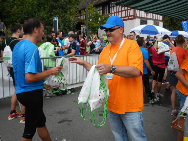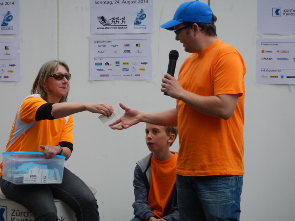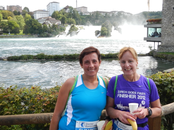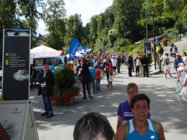 Im Zielbereich ist absolute Höchstsaison mit Rheinfall-Touristen. Entsprechend dicht ist die Menschenmenge dort, wo sich die Finisher mit ihrem Geschenk, einer hübschen, blauen Thermoskanne mit den Logos des Rheinfall-Laufs und des Züri-Laufcups, ins Sightseeing einreihen.