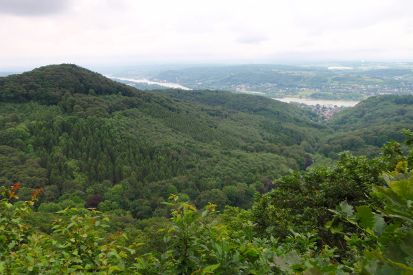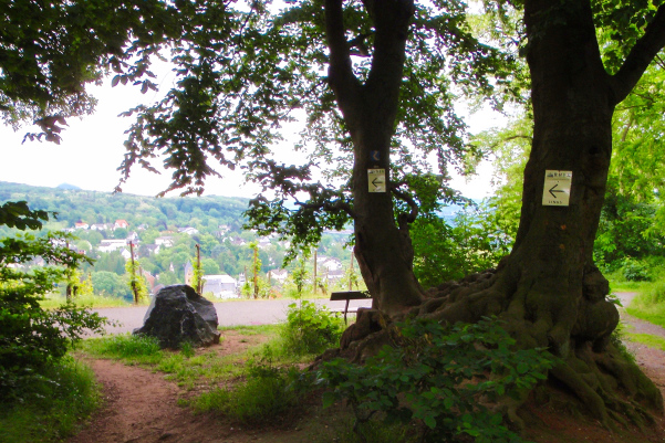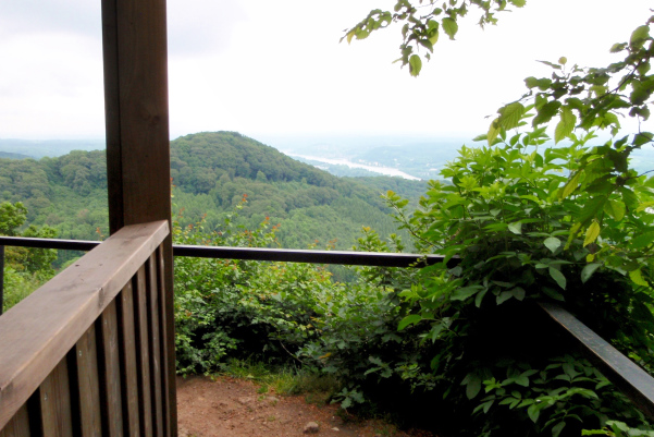 Einen herzlichen Wunsch muss ich hier aber auch gegenüber den Veranstaltern äußern: Die letzte dieser Aussichten, die vom Tal aus übrigens unmittelbar oberhalb einer beeindruckenden Felswand aus Basaltgestein liegt, solltet Ihr unbedingt in den nächsten, den 10. RHEX einbeziehen: Dazu braucht es nur zwei Absperrbänder quer über den Weg, und die Verbindungswege zur Aussicht erfordern gerade einmal 40, 50 Zusatzmeter. Dafür sieht man von dieser Aussicht phantastisch das Rheintal gegen Süden, bei schönem Wetter bis weit in die Eifel und sehr schön das Siebengebirge mit seinen Bergen, die wir im weiteren Verlauf des RHEX noch erklimmen werden.