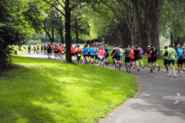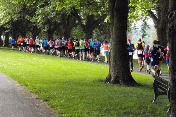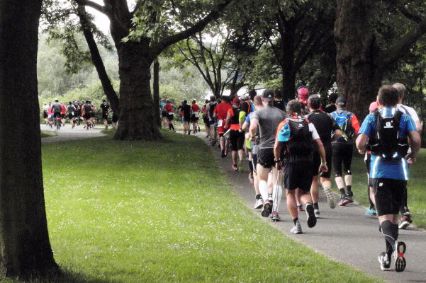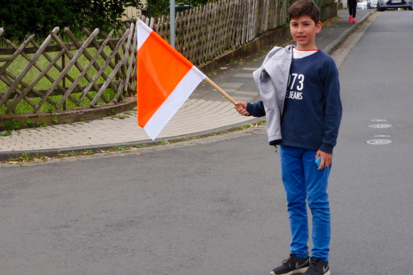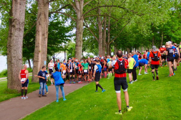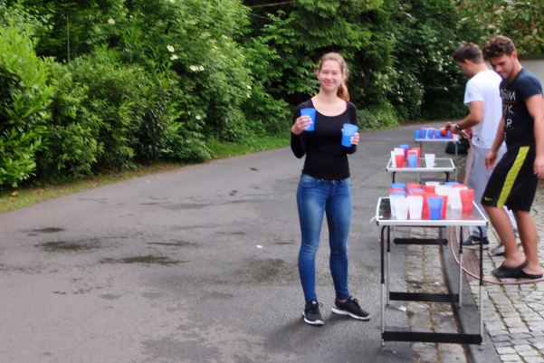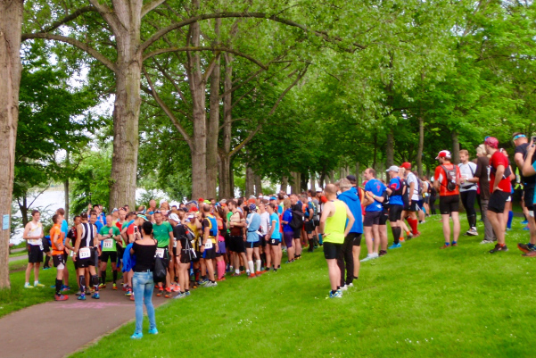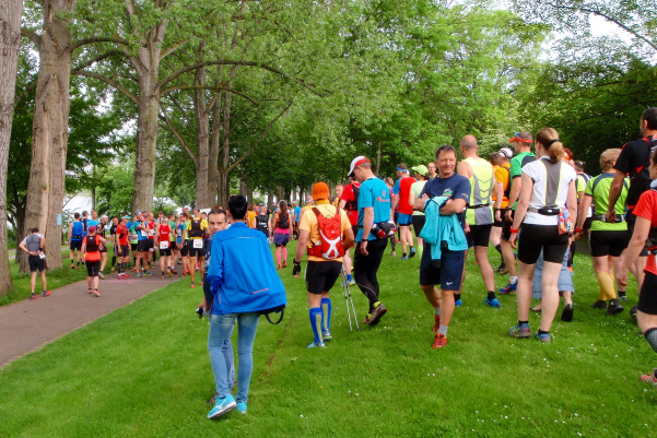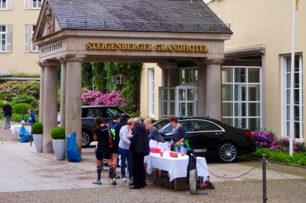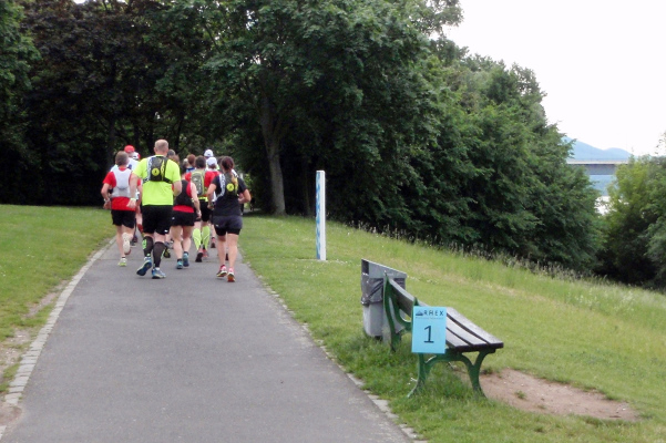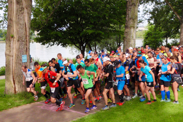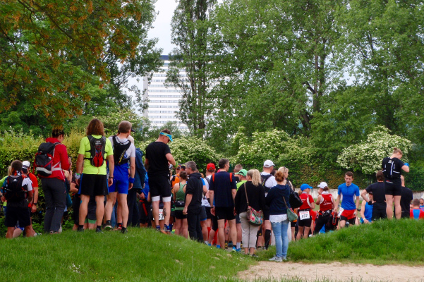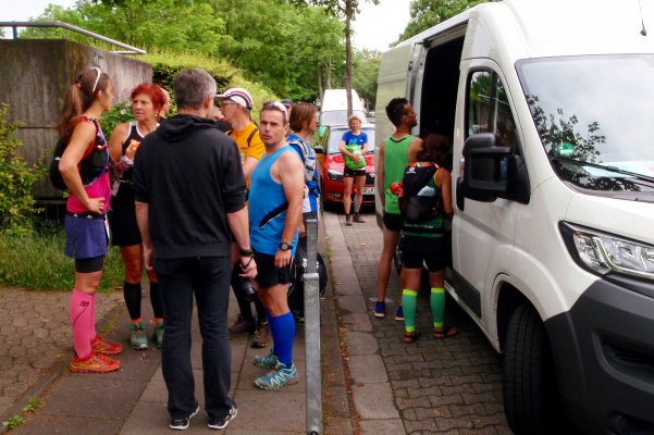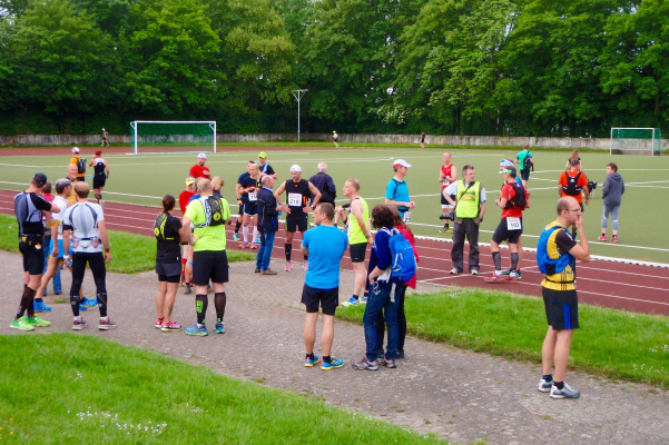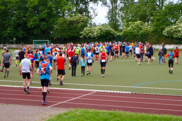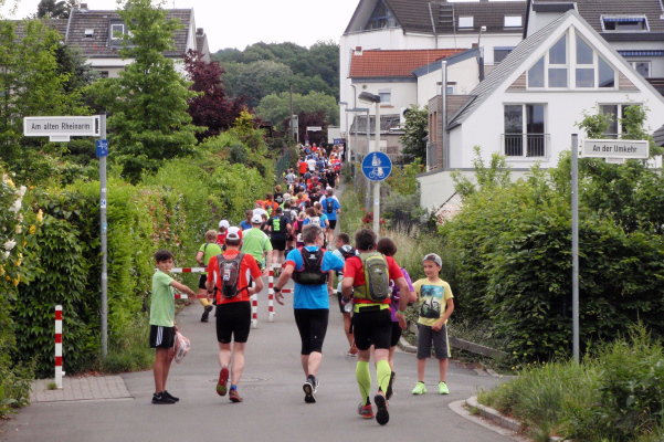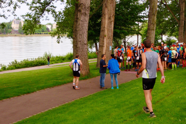 So hoffen wohl die meisten Teilnehmer, die sich am Sonntagmorgen an der Sporthalle des Kardinal-Frings-Gymnasiums in Bonn-Beuel einfinden, dass es einstweilen trocken bleiben möge, zumindest bis der Abstieg vom Drachenfels geschafft ist, denn damit hätten wir zwei der drei steilsten Abstiege hinter uns gebracht. Im Moment ist es bewölkt, nicht unfreundlich, jedoch etwas schwül. Auf dem Sportplatz hinter der Sporthalle versammeln sich die Teilnehmer diesmal schon eine Viertelstunde vor dem Start, denn einen „fliegenden Start“ wie im vergangenen Jahr soll es laut den Veranstaltern in diesem Jahr nicht geben.