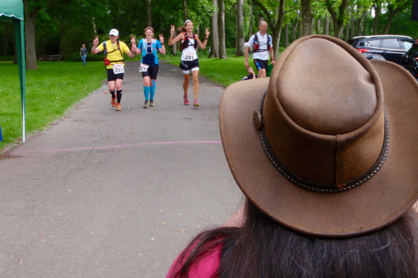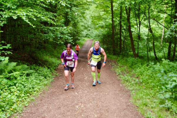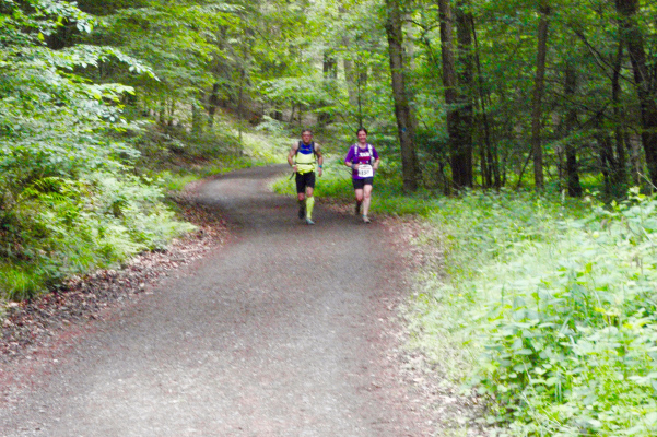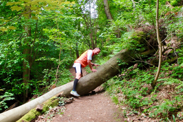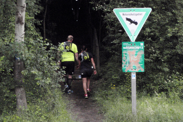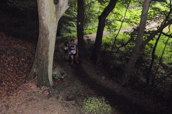 Hinter der Kuckstein-Aussicht folgt überraschend schon einer der Höhepunkte der gesamten Laufstrecke: Nach der Abzweigung des Nücker Felsenwegs – längs der erwähnten Felswand talab – schwingt der Weg so elegant durch einen Wald mit bizarren Baumstämmen, dass man bei einem flotten Trainingslauf hier denkt, man fliege regelrecht durch diesen Wald den Hang hinunter. Leider ist es hier so dunkel, dass mein Fotoapparat auch dieses Jahr nur unscharfe Fotos produziert; umsonst also die Mühe, dass ich noch einmal versucht habe, an einigen Läufern dranzubleiben. Und nach den Fotostopps sind auch die auf und davon, während ich kurz darauf die erste Verpflegungsstelle vor der Berghovener Straße erreiche (km 7,3). Die Straße wird gut gesichert gequert – bei Trainingsläufen muss man hier ziemlich aufpassen.