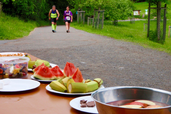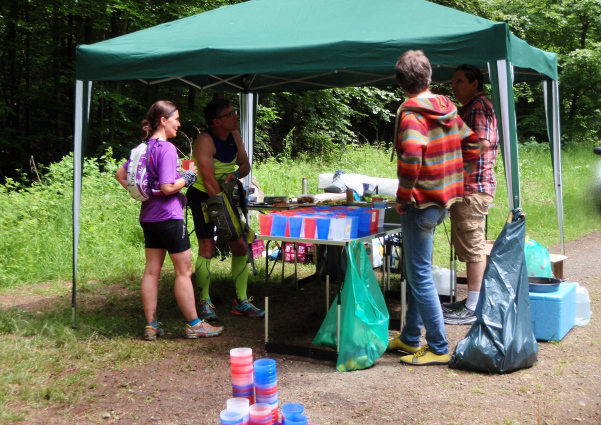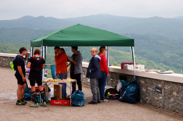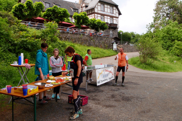 Am Löwenburger Hof folgt die vierte Verpflegungsstation (km 24,3). Wieder gibt es Melonen wie am Drachenfels – meine liebste Läufernahrung angesichts der etwas schwülen Verhältnisse. Die Aussicht ist hier gut, wenngleich sie nicht zum Rhein, sondern in den Osten blicken lässt. Nicht die Veranstalter des RHEX, die sich möglichst genau an den Verlauf des Rheinsteigs halten, sondern die Rheinsteig-Verantwortlichen verdienen hier aber wegen der Fortführung des Rheinsteigs Kritik. Denn den Premium-Wanderweg jetzt lieblos auf einem Fahrweg durch die Ostflanke des zweithöchsten Siebengebirgsberges zu führen, ist wenig einfallsreich. V