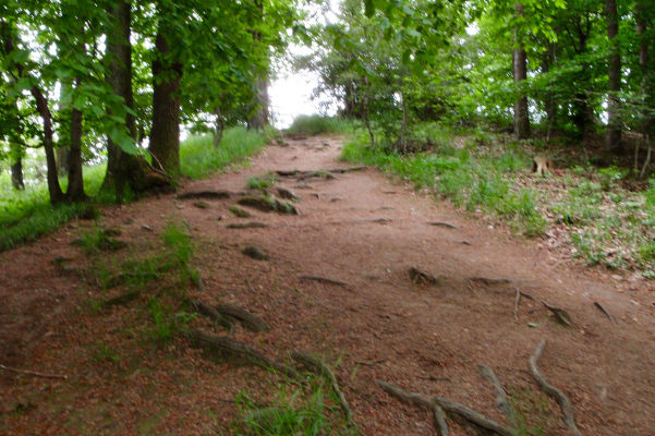 Der breite Weg vom Drachenfels zur Margarethenhöhe wird nur kurz nach links hin überquert, weil sich der Weg an den Abfall des Hanges ins Rhöndorfer Tal begibt – und damit auf den Kamm, dem RHEX-Läufer nun über den Geisberg folgen dürfen. Kurz vor dem Gipfel mit seiner Schutzhütte und ihrer prächtigen Aussicht nach Rhöndorf und zum Rhein wird es sehr steil und nach wenigen noch flachen Metern geht es auch jenseits sehr steil hinunter. Immerhin ist der Hang nicht sehr nass und insofern gut zu belaufen.