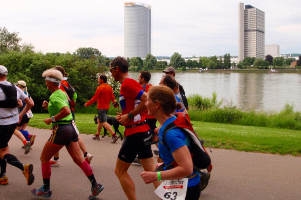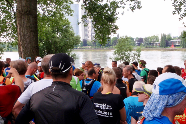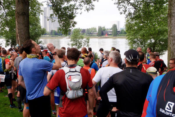 Eingelaufen haben sich nur wenige Läufer und Läuferinnen, denn offensichtlich weiß jeder, dass die ersten zwei Kilometer am Rhein und durch den Rheinauepark noch flach sind – ideal zum Einlaufen. Das enge Tor des Sportplatzes entlässt überraschend schnell alle Teilnehmer auf den Gehweg am Rhein, auf dem mit einem simplen Farbstrich und einem „RHEX-Start“ die Startlinie markiert sind. Und auch die Aufstellung der Läufer geht flugs vonstatten. Ob dabei wohl die Kulisse der jenseits des Rheins stehenden Hochhäuser wahrgenommen wird? Denn immerhin ist Bonn UN-Stadt und Sitz der DHL – der „Post“ –, deren Hauptverwaltung im höchsten deutschen Hochhaus außerhalb von Frankfurt residiert.