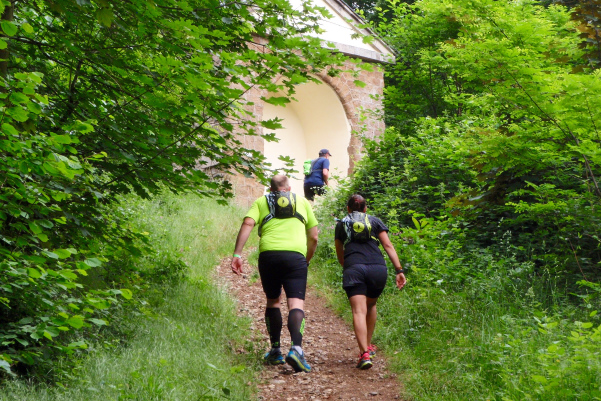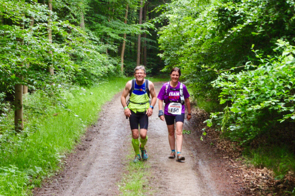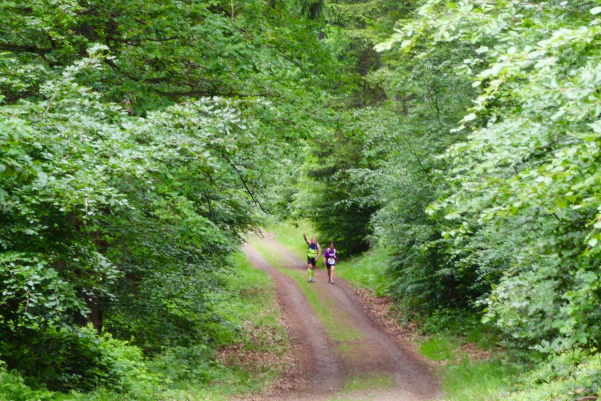 Im Schmelztal wird die nächste Straße überquert, kurz ein Regenrückhaltebecken umlaufen, ehe im Wald für den Läufer vor und die beiden Läufer hinter mir ein kleiner Schock folgt: Denn zehn Meter weiter geht es sehr steil hinauf, so dass sogar Tritte in den Hang gegraben sind; auch ein Stein mit Wegmarkierungen ist hier schon abgestürzt. Doch schnell ist der Weg erreicht, dem wir nun das Schmelztal hinein folgen. Zweimal gibt es kurze, steile Anstiege: Die Läufer hinter mir sind etwas erschüttert, während ich wegen meines Testlaufs den Weg hier sehr gut kenne und weiß, dass am Ende des langen dritten Aufstiegs die vorletzte Verpflegungsstation mitten im Wald wartet (km 28,3). Noch ist der höchste Punkt am Himmerich nicht erreicht; ein breiter, aber schöner Waldweg zieht erst länger bergab, dann wieder bergauf. „Hier wird jeder kleine Hügel zum Berg“, meint eine Läuferin und fällt wieder in den Gehschritt. Ich genieße den hübschen Weg hier eher und sinniere: Steht „Himmerich“ für den Himbeerenberg oder für den Hirschkuhberg?
