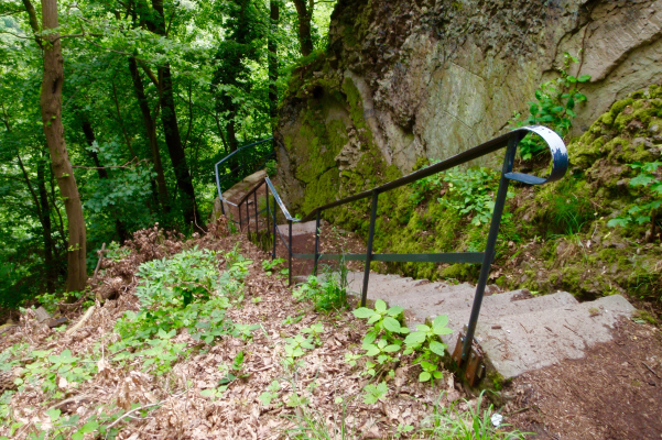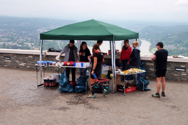 Spätestens hier ist es Zeit für einen längeren Verpflegungsstopp, zumal ich inzwischen wieder einige Läufer eingeholt habe und mich auch nicht mehr gar so schlapp fühle. Merkwürdig, ich erhole mich mit dem „Extremlaufen“! Die Müsliriegel gehen heute schlecht – klar, denn der Kirschstreusel daneben ist viel saftiger. Ein paar englischsprachige Touristinnen können es nicht fassen, dass es die schöne Verpflegung zwar kostenlos, aber nur für die „runners“ gibt. Hier oben könnte man es eine Weile aushalten! Aber wer den RHEX zum ersten Mal läuft und sich zum Weiterlaufen entschlossen hat, wird gleich mit der fast schon alpinen Seite des Drachenfels‘ konfrontiert. Zwar zuerst mit einer Treppe, dann aber einem sehr schmalen Weg durch abschüssiges Gelände, später weiteren Treppen mit Geländer und längs Felsen geht es den steilen Hang hinunter.