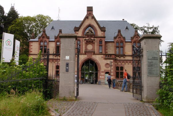 Im Folgenden ist der Rheinsteig etwas merkwürdig markiert, teilweise ummarkiert worden: Umso erfreuter bin ich, dass die RHEX-Richtungsschilder – übrigens während der gesamten Laufstrecke – hier eindeutig die interessanteste Wegvariante direkt zum „Milchhäuschen“ wählen. Nach links gibt es oberhalb der sehr schönen Ausflugsgaststätte einige Erosionsgräben, die für Kinder einen idealen Abenteuerspielplatz bieten. Ich bin aber flugs am Milchhäuschen vorbei gelaufen, und erst die geradeaus weisenden RHEX-Schilder rufen mir in Erinnerung, dass es von hier aus nicht relativ flach längs der „Wolkenburg“ zum Drachenfels geht, sondern erst noch ziemlich tief bergab bis unterhalb der Drachenburg. Eine gemütliche Abwärtspassage, dann eine schöne, heute tiefmorastige Schlucht bieten aber eine abwechslungsreiche Wegstrecke, ehe es kurz vor der Drachenburg – dem „rheinischen Neuschwanstein“ – links auf „gepflegten Wanderwegen“ und mit dem steilen „Eselsweg“ zum Drachenfels hinauf geht. Eng führt der Weg zwischen links und rechts aufragenden Felsen hindurch. Umso überraschender ist dann der freie Ausblick auf der großen, neu und sehr einladend angelegten Aussichtsterrasse, wo uns die dritte Verpflegungsstation mit ihren netten Helfern empfängt (18,9 km).