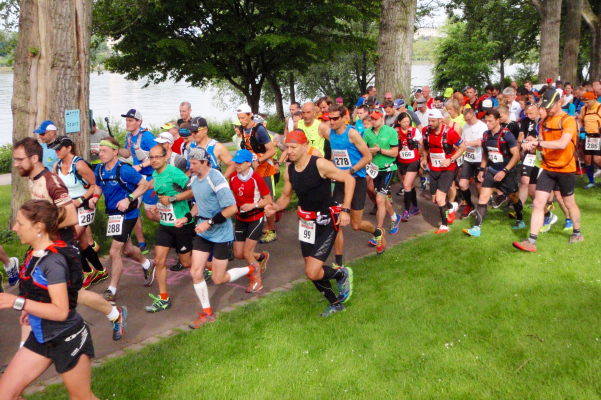 Die Wetterprognose klingt nicht gut für diesen Sonntag: Bewölkt, Gewitter mit Starkregen, ja sogar örtliche Unwetter drohen. Trotzdem finden sich 235 Starter am Kardinal-Frings-Gymnasium auf der Bonn-Beueler Rheinseite ein. Es gibt sogar zahlreiche Nachmelder. Denn der Rheinsteig hat einen guten Ruf, nicht nur vor Ort um Bonn und Köln, sondern auch darüber hinaus: Nach dem Lauf fahre ich in der Stadtbahn mit mehreren Läufern zurück, die von Aschaffenburg angereist sind. Von Bayern nach Nordrhein-Westfalen für einen Landschaftslauf! Und das trotz eines gravierenden Mankos: Der Lauf misst nur 35 Kilometer, ist also nichts für Marathonsammler. Seine vom Veranstalter angegebenen 1250, nach eigener (barometrischer) Messung sogar 1290 Höhenmeter lassen ihn jedoch anforderungsmäßig einem Marathon in der Ebene entsprechen.