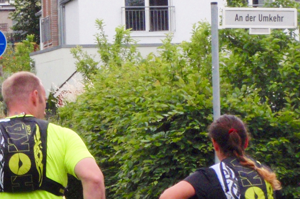 Und schon, pünktlich um 9:15 Uhr, „geht die Post ab“. Ein schönes Bild – die anfangs noch geschlossene Läuferschlange, die sich elegant durch den Rheinauepark schlängelt. Ich laufe zeitweise auf dem parallelen Radweg und versuche ein paar schöne Eindrücke zu fotografieren - und bin, ehe ich mich versehe, ans Ende der Läuferschlange durchgereicht. Schon hier merke ich, dass das heute überhaupt nicht klappen will: Die Erkältung macht mich schlapp. Und so schaffe ich zwar die Straßenbahnschranken, bevor sie sich senken und kann schön die Läufer an der allerersten Steigung fotografieren. Bezeichnenderweise gibt es just hier ein Straßenschild „An der Umkehr“. Gleichwohl ist es für mich aber keine Versuchung umzukehren, denn ob fit oder schlapp – den Rheinsteig-Extremlauf laufe ich heute als Genusslauf!