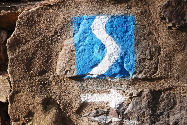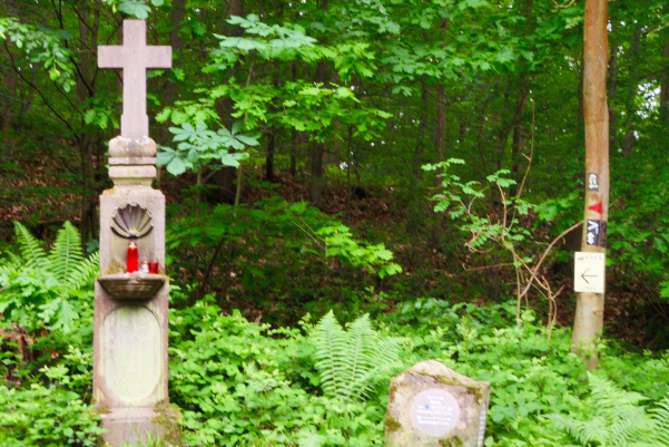 An der Kirche von Küdinghoven und oberhalb ihres Friedhofs folgt die nächste heftige Steigung. Wer schlau ist und „genussläuft“, wählt hier zum ersten Mal den Gehschritt. Denn es heißt Kräfte zu sparen. Wir verlassen den bebauten Bereich – in den wir erst wieder drei Kilometer vor dem Ziel eintauchen werden – und überqueren kurz darauf die Autobahn; übrigens verläuft der Rheinsteig auf den nächsten 30 Kilometern weder über Straßen noch an diesen entlang, weil sie allenfalls überquert werden. Und dies trotz der Warnungen vor dem Lauf immer gut gesichert, selbst bei weit fortgeschrittener Zeit und nur noch tröpfelweise kommenden Läufern. Ein großes Lob den Streckenposten von Polizei und Veranstaltern!
