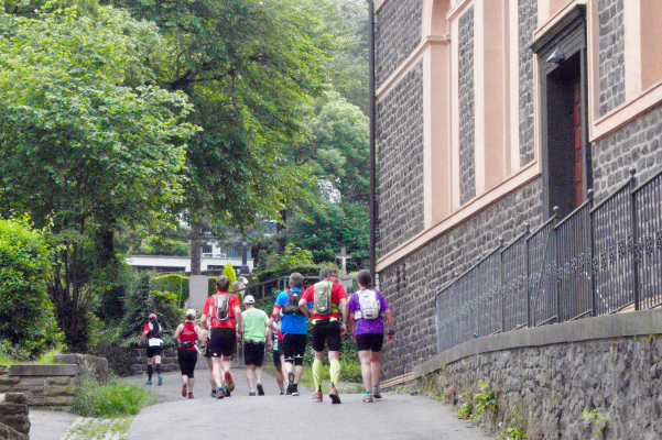 Doch gemach: Vorher sitzt am höchsten Punkt der Himmerich-West-Querung ein Streckenposten, der eindeutig jeden RHEX-Läufer aus seinen Träumen reißt und nach rechts unten weist: Von einigen Miniaufstiegen weiter unten abgesehen, beginnt hier endgültig der Abstieg. Und wie: Über eine sehr steile, in Falllinie gerade abwärts führende Trasse mit glitschigen Steinen! Das ist nach 30 Kilometern eine heftige Überraschung! Noch einmal hoch konzentriert gilt es, sturzfrei die nächsten 600 Meter hinter sich zu bringen: Dann landet man auf der Straße zum Himmerich und einer parallel ebenso bequem weiter talab führenden Forststraße. Die ersten Häuser von Bad Honnef zeigen sich, kurz darauf auch die Jugendherberge mit der letzten Verpflegungsstation (km 32,3): Noch einmal etwas trinken, ehe ein schöner Fußweg hinter Gärten und dann wenig befahrene Straßen weiter talwärts leiten – rheinwärts. Selbst hier und jetzt, fünf Stunden nach dem Start, ist die Querung einer Hauptstraße noch gesichert, und an allen Abbiegungen stehen meist Jugendliche, um auch den späten Läufern den richtigen Weg zu weisen. Eine tolle Leistung der Veranstalter und ihrer Helfer!