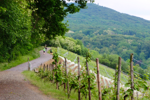 Der nächste Anstieg zum oberen Ende des nördlichsten Weinberges Westdeutschlands an der Dollendorfer Hardt ist vergleichsweise harmlos, weil er keine Steilheiten bietet, dafür aber endgültig die erste freie Aussicht über das Rheintal und auf den im Süden hoch aufragenden Petersberg. Unschön ist dieses Jahr auf diesem Wegabschnitt nur das grobe Geröll, mit dem der Weg befestigt worden ist; hoffentlich bringt man noch eine feinere Schicht auf, damit man künftig hier laufend wieder besser die Aussicht genießen kann.