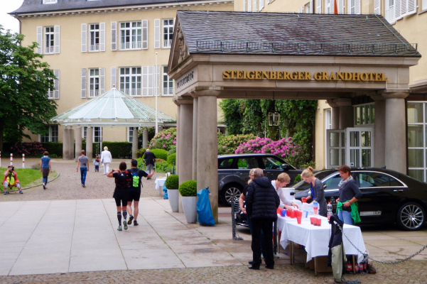 Nur gut 40 Höhenmeter misst der nächste Abstieg; ich überquere vor einem anderen Läufer – ich bin also doch nicht der letzte – gut gesichert die nächste Straße. Wieder folgt ein schöner Wegabschnitt bis vor die Mauern des ehemaligen Klosters Heisterbach: Links freies Feld, rechts der Wald, der unmittelbar neben dem schönen Trail sehr steil in eine steile Schlucht abstürzt. Möglicherweise haben diese im Siebengebirge und im Bergischen Land häufigen, steil eingeschnittenen Schluchten als „Siepen“ auch dem Siepen-Siebengebirge seinen Namen gegeben. Gleich am Beginn des Klosterparkplatzes wenden wir uns dann nach rechts und laufen am Nordhang des Petersbergs nur langsam bergauf – gleichsam als traute sich der Rheinsteig nicht, den „ersten richtigen Berg“ in Angriff zu nehmen. An einem Wegkreuz ist es dann aber „vorbei mit lustig“, jetzt geht es unbequem – und trailig-schön! – den Berg hinauf: 200 feine Höhenmeter am Stück, zum Schluss auf teilweise felsigem Pfad! Auf dem straßen- und parkplatzerschlossenen Petersberg gibt es oben ein Plateau mit dem früheren Gästehaus der Bundesregierung. Das Steigenberger Grandhotel ist noch heute im Besitz des Bundes. Selbst US-Präsident Clinton soll 1994 hier oben gejoggt sein. Er wird nicht weit gekommen sein, denn die Hänge fallen allseits steil ab. RHEX-Läufer freuen sich hingegen unmittelbar vor dem Portal des Grandhotels über den nächsten Verpflegungspunkt (km 12,5).