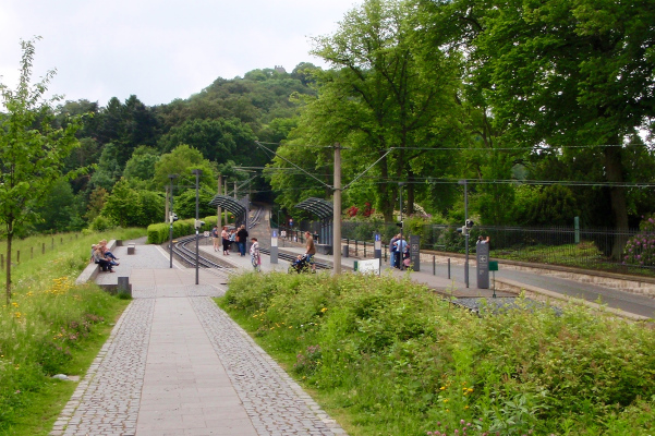 Die B42 im Tal wird mit einer Unterführung bequem unterquert, während die Bahnstrecke mit einer hohen Brücke überquert werden muss: Nein, das ist nicht der letzte Berg, meinen die Streckenposten. Und in der Tat: Auch die Brücke über einen Altarm des Rheins hinüber zur Insel Grafenwerth bietet noch einmal einen sanften Anstieg.
