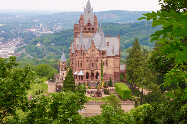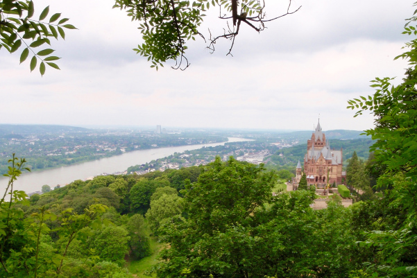 ier Tage zuvor bei einem Testlauf wählte ich die weitaus schönere Variante: Wenige Meter nach der Gaststätte rechts in den Nordhang des Berges (anfangs sehr gut laufbar), dann auf schönem Felsenweg hinauf zum breiten Weg, der „andersherum“ über den Südhang hinaufführt, und kurz auf gemeinsamem Weg zur Burgruine auf dem Gipfel. Beim „Drachenlauf“ wird immerhin der breite Weg bis zum „Wendeplatz“ in der Vorburg als Wendestrecke belaufen; von dort aus bietet sich ein weiter Blick nach Osten, kurz vorher am Weg aber auch nach Westen. Wer hier wandert, sollte unbedingt bis auf den Gipfel gehen, wo ein einzelnes, schirmartiges Bäumchen steht, das man bei klarem Wetter selbst von Bonn aus erkennen kann. Fünfmal kann man von der Löwenburg aus den Rhein sehen. Der Gipfel könnte einer der „Top Ten“, einer der zehn schönsten Orte Deutschlands, sein.