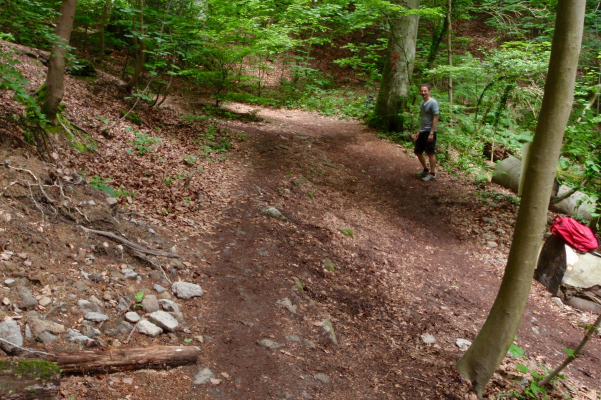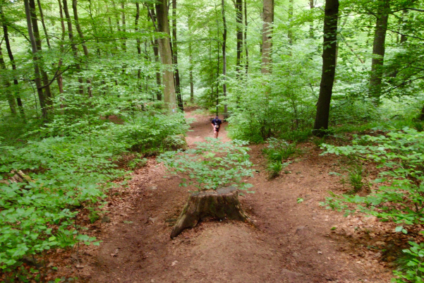 Hinter der Autobahn zeigt der RHEX sogleich die Zähne: Mit genau 100 Treppenstufen und einem kurzen steilen Hang geht es zum Foveauxhäuschen – und von den gewonnenen 90 Höhenmetern gleich wieder 50 hinab. Vor der Autobahn entfernen wir uns dann aber doch endgültig auch von diesem vielbefahrenen Verkehrsweg. Langsam und allmählich, mit einer Straßenquerung, geht es oberhalb des (nicht sichtbaren) Dornheckensees auf den Kuckstein. Rechts dieses noch breiten Weges gibt es in den steilen Hängen sehr schöne Trails und sechs schöne Aussichten. Von Bonn aus ist das ein sehr gutes Trainingsgelände, das man beispielsweise vom ehemaligen Regierungsviertel aus – wo heute rund 40.000 Menschen arbeiten – in kaum einer halben Stunde erreicht.