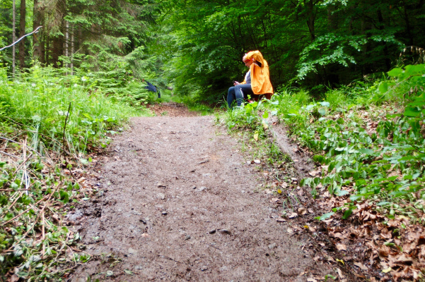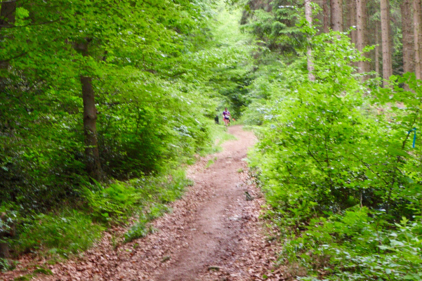 Zurück zum RHEX und wie gesagt auf den breiten Weg durch die Ostflanke der Löwenburg. Wo der Löwenburg-Rundweg nach Westen abbiegt und der breite Weg auf den Gipfel beginnt – am höchsten Punkt des gesamten RHEX (ca. 375 m) –, geht es geradeaus weiter – steil hinab ins Tal des Poßbachs. Das ist nun für mich ein eher zweifelhaftes Vergnügen, denn auf 2,2 Kilometern geht es genau 220 Höhenmeter auf einem befestigten Forstweg bergab. Im letzten Jahr kam ich unten angelangt mit Krämpfen in beiden Oberschenkeln minutenlang nicht mehr weiter! Diesen „Spaß“ gönne ich mir heute ebenso wenig wie bei meinem Testlauf vier Tage zuvor (und dabei sogar noch vom höheren Löwenburg-Gipfel aus): Tänzeln, immer tänzeln, auch wenn es auf einer Forststraße eigentlich nichts zum Tänzeln gibt. Zum Glück ist der Weg nass und an seinem Rand ist einiges Lockermaterial zusammengeschwemmt. Die Trailschuhe sorgen für sicheren Tritt im weicheren Geläuf. Und ich bekomme heute keinen einzigen Krampf.