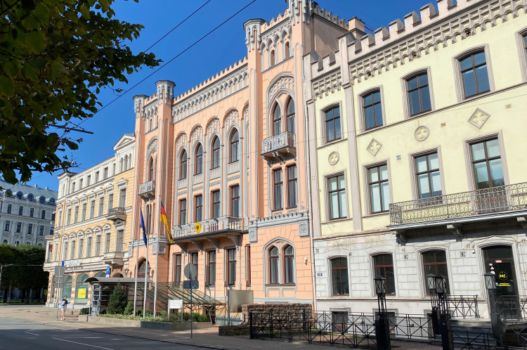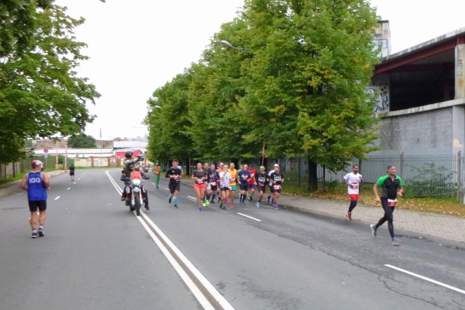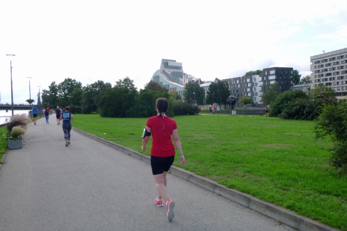Ein spannender Abschnitt beginnt hier. In einigen Schleifen wird uns die Neustadt vorgestellt. Dazu gesellen sich die Halbmarathonis, deren Masse aber vor uns läuft. Die Laufwege sind immer breit genug, damit dürften auch die Schnelleren gut zurecht gekommen sein. In der ab der zweiten Hälfte des 19. Jahrhunderts angelegten Neustadt, die mit der Altstadt seit 1997 Unesco-Welterbe ist, gibt es wunderschöne Beispiele großstädtischer Jugendstilarchitektur zu sehen. In den prunkvollsten Gebäuden residieren viele ausländische Vertretungen, so auch die deutsche Botschaft an der Esplanade. Die liegt am Park, der den ehemaligen Festungsanlagen entspricht. Der Wassergraben kann mit kleinen Booten befahren werden. Einige Fassaden sind noch schwarz verrußt und warten auf eine Renovierung. Oft wurden die Häuser nach dem Ende der Sowjetunion an ihre früheren Eigentümer oder deren Nachkommen zurückgegeben. Die Stadt Riga erwartet im Gegenzug aber den Unterhalt der Gebäude, was natürlich ein finanziell schwieriges Unterfangen sein kann.