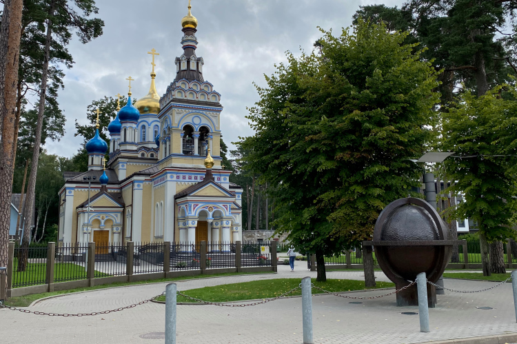 Wir kommen, wie schon beim Eintritt in den Park, an einer riesigen Eichhörnchen-Skulptur vorbei und verlassen die Anlage wieder. Inzwischen kennen wir einige Mitstreiter. Das Tempo hat sich also eingespielt. Über die schöne Allee geht es zurück Richtung Zentrum. Ein riesiges Bauwerk am Ende der Villenzone beherbergt das Finanzamt. Die Tankstellen verkaufen den Liter Benzin hier um 20 Cent billiger als in Deutschland. Die Restaurantpreise sind auch eher günstig. Links liegt der große Pokrov-Friedhof und rechts gab es früher auch einen Friedhof. Der wurde während der großen Pest-Epidemie angelegt und während der sowjetischen Besatzung aufgegeben. Übrig blieben nur einige Mausoleen und vereinzelt sieht man noch Grabsteine.
