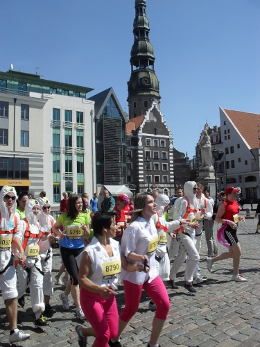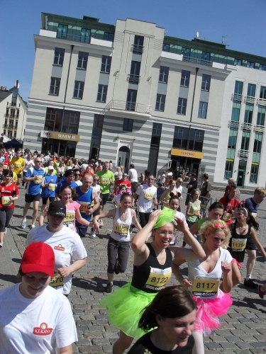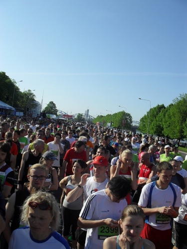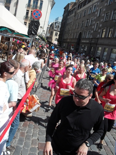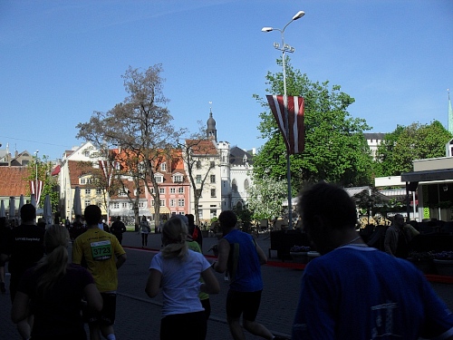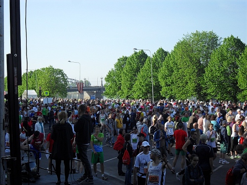Am Starttag selber brauchte ich dann nur eine kurzen Fußmarsch von 15 Minuten und schon war ich am Ufer des Flusses Daugava (auf Deutsch: Düna) am Rande der Altstadt. Auf der dort sonst so belebten Hauptverkehrsstraße, die komplett gesperrt war, herrschte reges Treiben, denn Jeder orientierte sich wo der Start, wo das Ziel und wo die Kleidersackabgabe … und natürlich wo die Toiletten waren. Auf dem Plan den wir bekommen hatten, stand ja alles haarklein drauf, nur in Realität sieht das dann doch etwas anders aus. Zunächst war auch nicht so ganz klar warum Start und Ziel recht weit auseinander lagen, doch das wurde später deutlich; Der Veranstalter brauchte Platz für die Startaufstellung der 5 km Läufer.