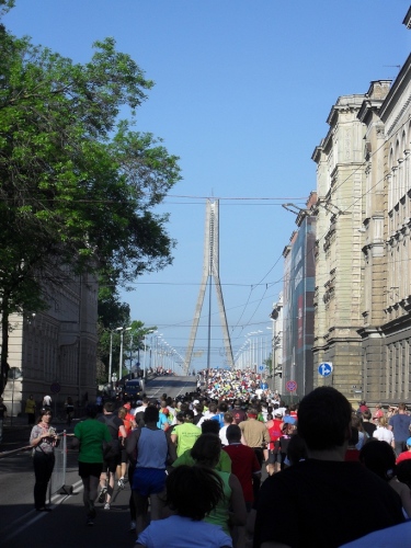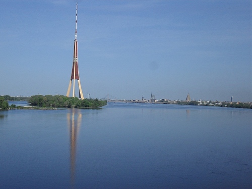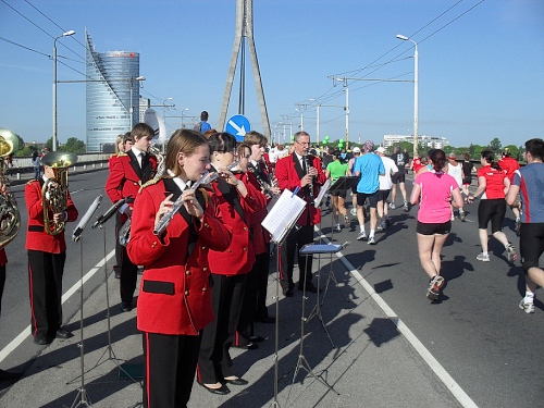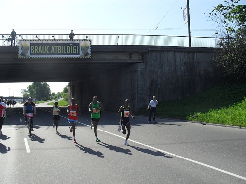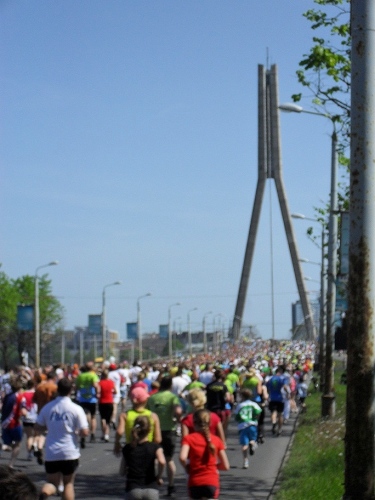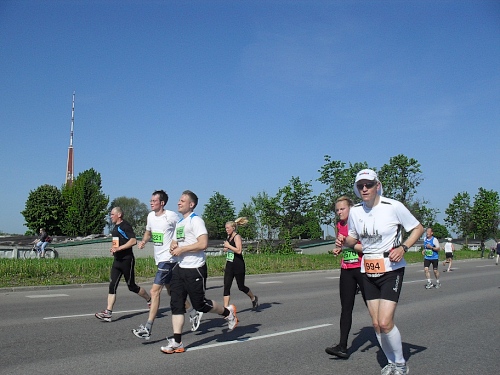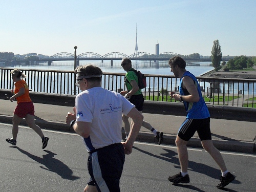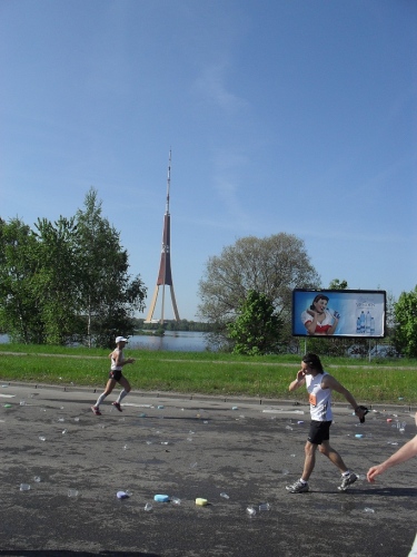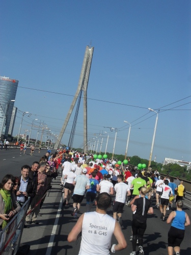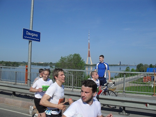 Ab dort war die Strecke ganz flach und asphaltiert und wir liefen 6 km auf der Uferstrasse bis zur Dinvidu Brücke. Auch hier wieder der Anstieg hinauf und erneut die Belohnung mit einem phantastischen Blick auf die „Skyline“ von Riga, diesmal mit Fernsehturm im Vordergrund. Mittlerweile war es doch schon recht warm geworden und bei 21 bis 22 Grad wurden die gut ausgestatteten Verpflegungsstände (Wasser, Iso, Bananen und Apfelsinen) reichlich genutzt.