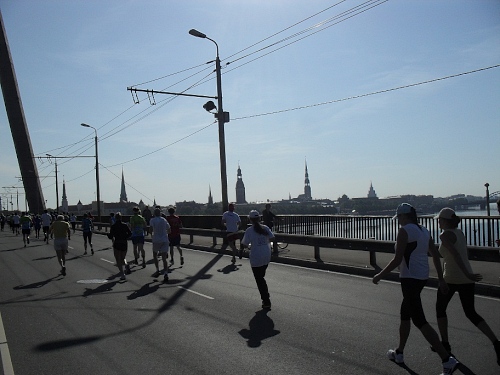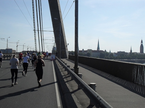 Wir liefen dann zunächst auf der ersten Halbmarathonschleife 1 km entlang der Düna, vorbei am Schloss, um dann in einem Bogen von 2 km auf die Vansu Brücke zu gelangen. Der leichte Anstieg dorthin ließ uns an Höhe gewinnen, sodaß sich dann tolle Ausblicke auf die Altstadt boten. Etwa 1 Kilometer hinter der Brücke wurde gewendet und die Brücke erneut überquert.